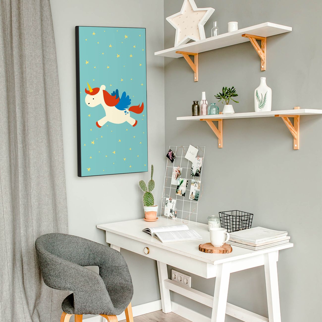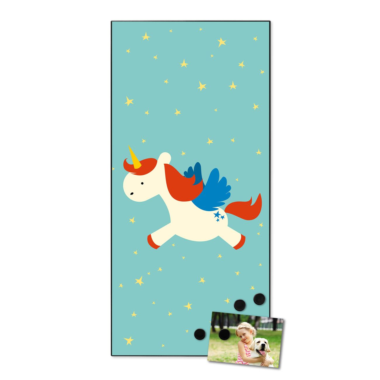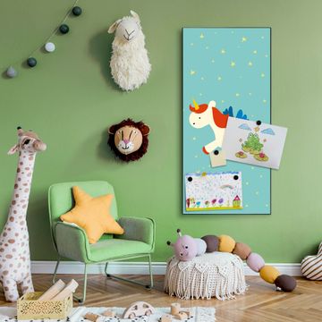 FUNKTION:  Die banjado Magnettafel mit Motiv Kleines Einhorn Motiv bringt Ordnung in Ihr Zettelchaos. Fotos, Termine, Notizen oder Rezepte lassen Sich hier stilvoll mit Magneten ordnen, Sie behalten alles im Blick. An der Design Magnettafel halten alle handesüblichen Magnete. DESIGN:  Die magnetische Pinnwand mit dem Motiv Motiv Kleines Einhorn ist ein eleganter Begleiter im Alltag. Mit dieser Memotafel aus Metall haben Sie auch ohne Notizen und Magnete ein schönes Dekoelement. Das Format bietet Ihnen ausreichend Platz um alle wichtigen Informationen im Blick zu behalten. DETAILS:  Die Magnettafel besteht aus silber-grau, weiß oder schwarzlackiertem Stahl. Sie hat eine Größe von 37 x 78 x 2cm. Es befinden sich auf der Rückseite vorgefertigte Aufhängungen die eine schnelle und unkomplizierte Anbringung ermöglichen. Das Motiv ist mit einem seidenmatten Laminat versehen und schützt so zusätzlich vor Kratzern. NUTZEN:  Sie können dieses Memoboard groß als Wandbild nutzen, es halten alle handelsüblichen Magneten daran. Die Pinnwand ist mit einem feuchten Lappen oder Schwamm abwischbar. Sie finden bei uns eine große Auswahl an passenden Magneten. BANJADO:  Wir sind ein kleines Team aus dem Herzen von Sachsen. Wir fertigen alle Artikel von Hand für Sie an, Sie erhalten keine preiswerte Importware. Auf Wunsch können Sie auch Ihr eigenes Foto auf die Magnettafel aufbringen, schreiben Sie uns an. Herzlichst, Ihr banjado-Team
