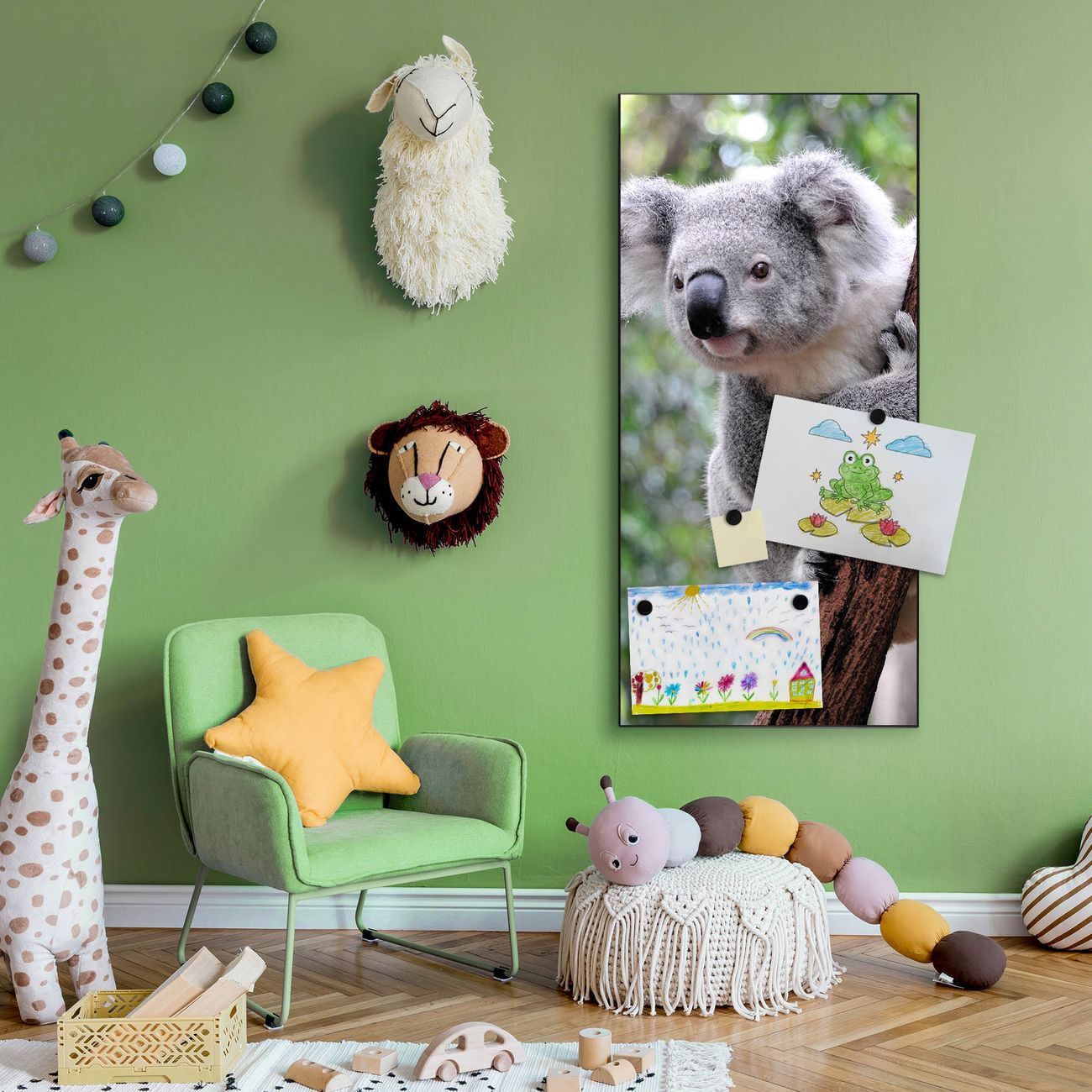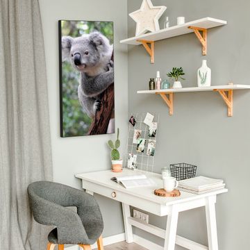 FUNKTION:  Die banjado Magnettafel mit Motiv Koala Motiv bringt Ordnung in Ihr Zettelchaos. Fotos, Termine, Notizen oder Rezepte lassen Sich hier stilvoll mit Magneten ordnen, Sie behalten alles im Blick. An der Design Magnettafel halten alle handesüblichen Magnete. DESIGN:  Die magnetische Pinnwand mit dem Motiv Motiv Koala ist ein eleganter Begleiter im Alltag. Mit dieser Memotafel aus Metall haben Sie auch ohne Notizen und Magnete ein schönes Dekoelement. Das Format bietet Ihnen ausreichend Platz um alle wichtigen Informationen im Blick zu behalten. DETAILS:  Die Magnettafel besteht aus silber-grau, weiß oder schwarzlackiertem Stahl. Sie hat eine Größe von 37 x 78 x 2cm. Es befinden sich auf der Rückseite vorgefertigte Aufhängungen die eine schnelle und unkomplizierte Anbringung ermöglichen. Das Motiv ist mit einem seidenmatten Laminat versehen und schützt so zusätzlich vor Kratzern. NUTZEN:  Sie können dieses Memoboard groß als Wandbild nutzen, es halten alle handelsüblichen Magneten daran. Die Pinnwand ist mit einem feuchten Lappen oder Schwamm abwischbar. Sie finden bei uns eine große Auswahl an passenden Magneten. BANJADO:  Wir sind ein kleines Team aus dem Herzen von Sachsen. Wir fertigen alle Artikel von Hand für Sie an, Sie erhalten keine preiswerte Importware. Auf Wunsch können Sie auch Ihr eigenes Foto auf die Magnettafel aufbringen, schreiben Sie uns an. Herzlichst, Ihr banjado-Team