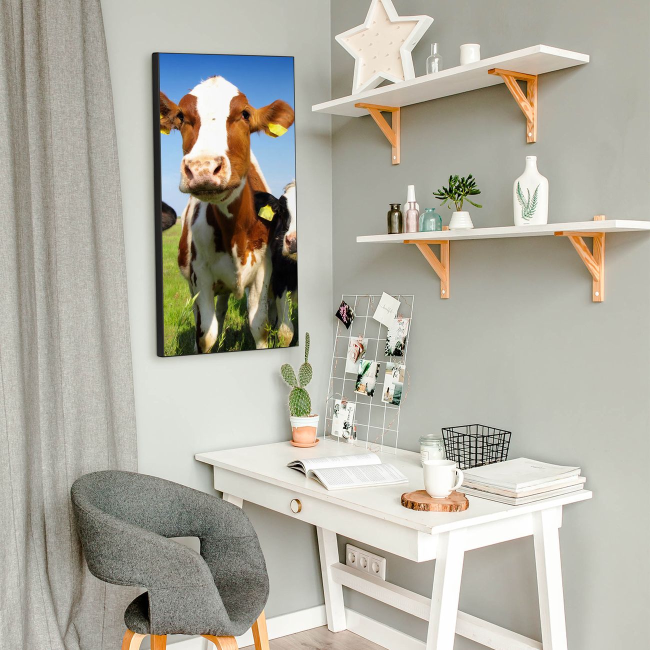 FUNKTION:  Die banjado Magnettafel mit Motiv Kühe Motiv bringt Ordnung in Ihr Zettelchaos. Fotos, Termine, Notizen oder Rezepte lassen Sich hier stilvoll mit Magneten ordnen, Sie behalten alles im Blick. An der Design Magnettafel halten alle handesüblichen Magnete. DESIGN:  Die magnetische Pinnwand mit dem Motiv Motiv Kühe ist ein eleganter Begleiter im Alltag. Mit dieser Memotafel aus Metall haben Sie auch ohne Notizen und Magnete ein schönes Dekoelement. Das Format bietet Ihnen ausreichend Platz um alle wichtigen Informationen im Blick zu behalten. DETAILS:  Die Magnettafel besteht aus silber-grau, weiß oder schwarzlackiertem Stahl. Sie hat eine Größe von 37 x 78 x 2cm. Es befinden sich auf der Rückseite vorgefertigte Aufhängungen die eine schnelle und unkomplizierte Anbringung ermöglichen. Das Motiv ist mit einem seidenmatten Laminat versehen und schützt so zusätzlich vor Kratzern. NUTZEN:  Sie können dieses Memoboard groß als Wandbild nutzen, es halten alle handelsüblichen Magneten daran. Die Pinnwand ist mit einem feuchten Lappen oder Schwamm abwischbar. Sie finden bei uns eine große Auswahl an passenden Magneten. BANJADO:  Wir sind ein kleines Team aus dem Herzen von Sachsen. Wir fertigen alle Artikel von Hand für Sie an, Sie erhalten keine preiswerte Importware. Auf Wunsch können Sie auch Ihr eigenes Foto auf die Magnettafel aufbringen, schreiben Sie uns an. Herzlichst, Ihr banjado-Team