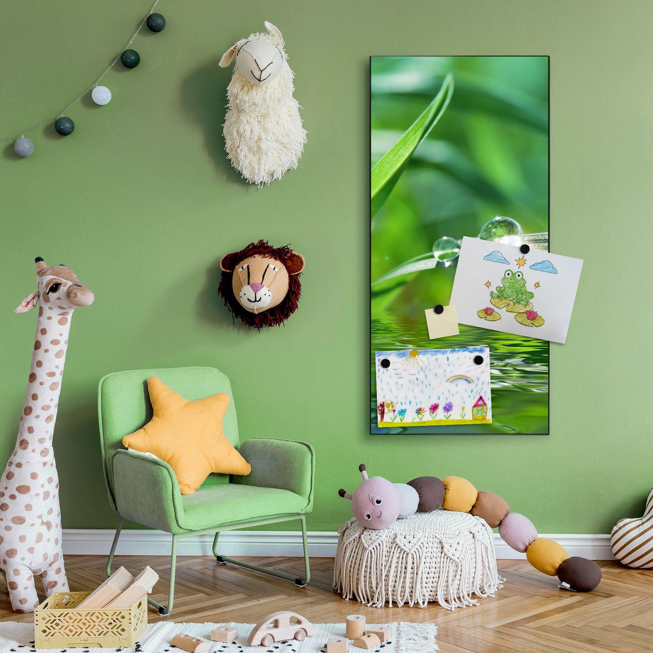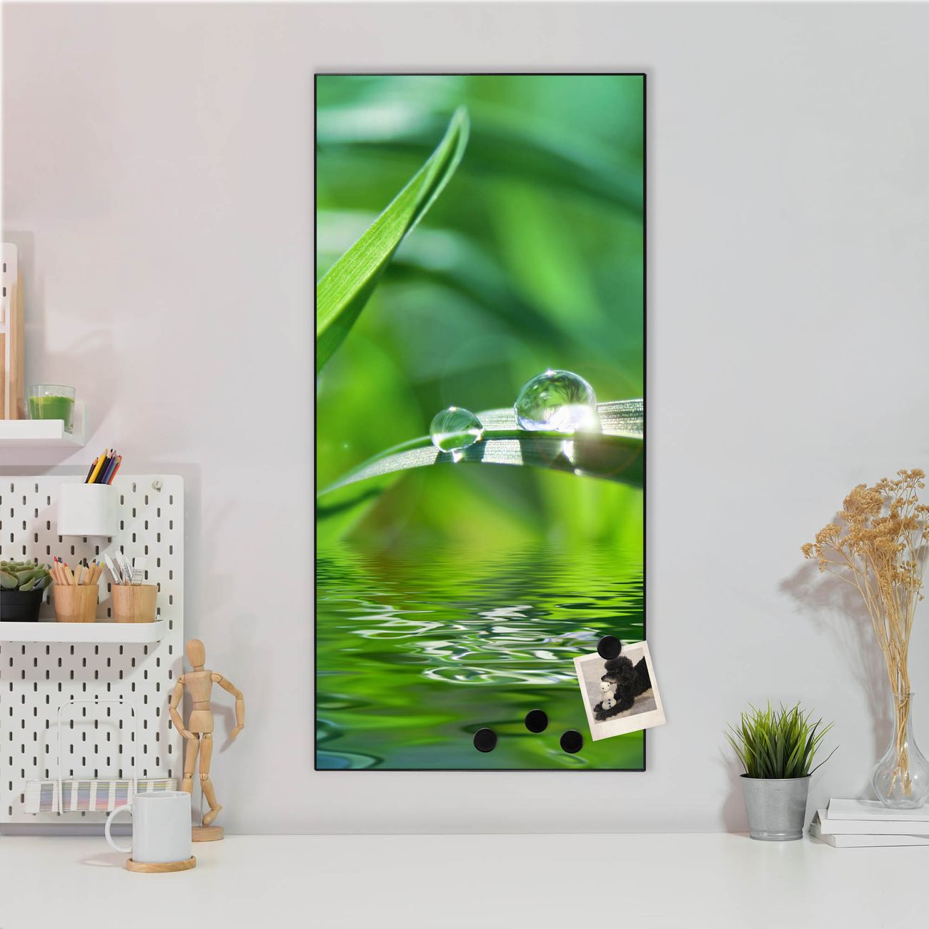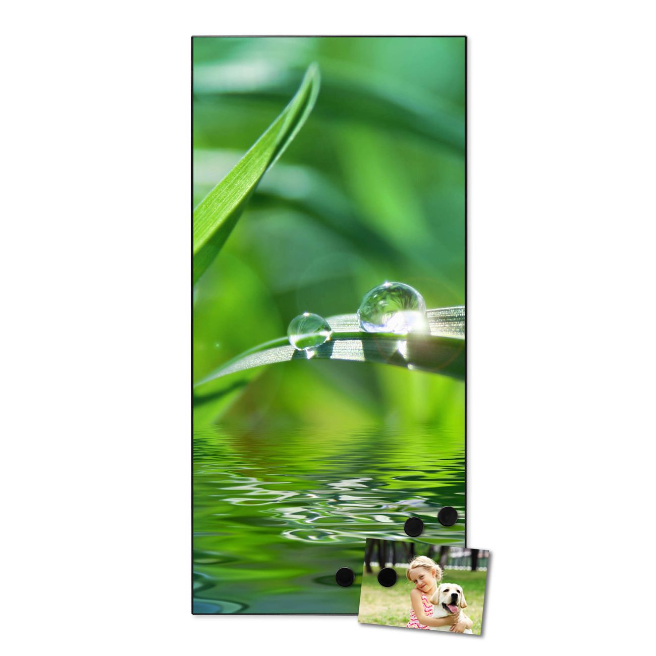 FUNKTION:  Die banjado Magnettafel mit Motiv Morgentau Motiv bringt Ordnung in Ihr Zettelchaos. Fotos, Termine, Notizen oder Rezepte lassen Sich hier stilvoll mit Magneten ordnen, Sie behalten alles im Blick. An der Design Magnettafel halten alle handesüblichen Magnete. DESIGN:  Die magnetische Pinnwand mit dem Motiv Motiv Morgentau ist ein eleganter Begleiter im Alltag. Mit dieser Memotafel aus Metall haben Sie auch ohne Notizen und Magnete ein schönes Dekoelement. Das Format bietet Ihnen ausreichend Platz um alle wichtigen Informationen im Blick zu behalten. DETAILS:  Die Magnettafel besteht aus silber-grau, weiß oder schwarzlackiertem Stahl. Sie hat eine Größe von 37 x 78 x 2cm. Es befinden sich auf der Rückseite vorgefertigte Aufhängungen die eine schnelle und unkomplizierte Anbringung ermöglichen. Das Motiv ist mit einem seidenmatten Laminat versehen und schützt so zusätzlich vor Kratzern. NUTZEN:  Sie können dieses Memoboard groß als Wandbild nutzen, es halten alle handelsüblichen Magneten daran. Die Pinnwand ist mit einem feuchten Lappen oder Schwamm abwischbar. Sie finden bei uns eine große Auswahl an passenden Magneten. BANJADO:  Wir sind ein kleines Team aus dem Herzen von Sachsen. Wir fertigen alle Artikel von Hand für Sie an, Sie erhalten keine preiswerte Importware. Auf Wunsch können Sie auch Ihr eigenes Foto auf die Magnettafel aufbringen, schreiben Sie uns an. Herzlichst, Ihr banjado-Team