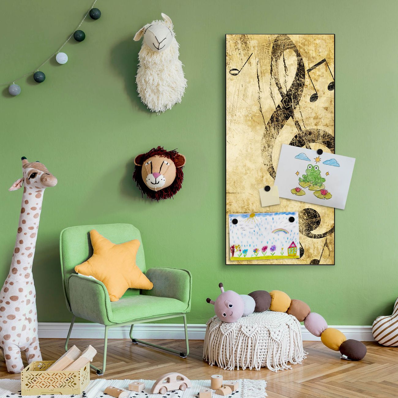 FUNKTION:  Die banjado Magnettafel mit Motiv Music Motiv bringt Ordnung in Ihr Zettelchaos. Fotos, Termine, Notizen oder Rezepte lassen Sich hier stilvoll mit Magneten ordnen, Sie behalten alles im Blick. An der Design Magnettafel halten alle handesüblichen Magnete. DESIGN:  Die magnetische Pinnwand mit dem Motiv Motiv Music ist ein eleganter Begleiter im Alltag. Mit dieser Memotafel aus Metall haben Sie auch ohne Notizen und Magnete ein schönes Dekoelement. Das Format bietet Ihnen ausreichend Platz um alle wichtigen Informationen im Blick zu behalten. DETAILS:  Die Magnettafel besteht aus silber-grau, weiß oder schwarzlackiertem Stahl. Sie hat eine Größe von 37 x 78 x 2cm. Es befinden sich auf der Rückseite vorgefertigte Aufhängungen die eine schnelle und unkomplizierte Anbringung ermöglichen. Das Motiv ist mit einem seidenmatten Laminat versehen und schützt so zusätzlich vor Kratzern. NUTZEN:  Sie können dieses Memoboard groß als Wandbild nutzen, es halten alle handelsüblichen Magneten daran. Die Pinnwand ist mit einem feuchten Lappen oder Schwamm abwischbar. Sie finden bei uns eine große Auswahl an passenden Magneten. BANJADO:  Wir sind ein kleines Team aus dem Herzen von Sachsen. Wir fertigen alle Artikel von Hand für Sie an, Sie erhalten keine preiswerte Importware. Auf Wunsch können Sie auch Ihr eigenes Foto auf die Magnettafel aufbringen, schreiben Sie uns an. Herzlichst, Ihr banjado-Team