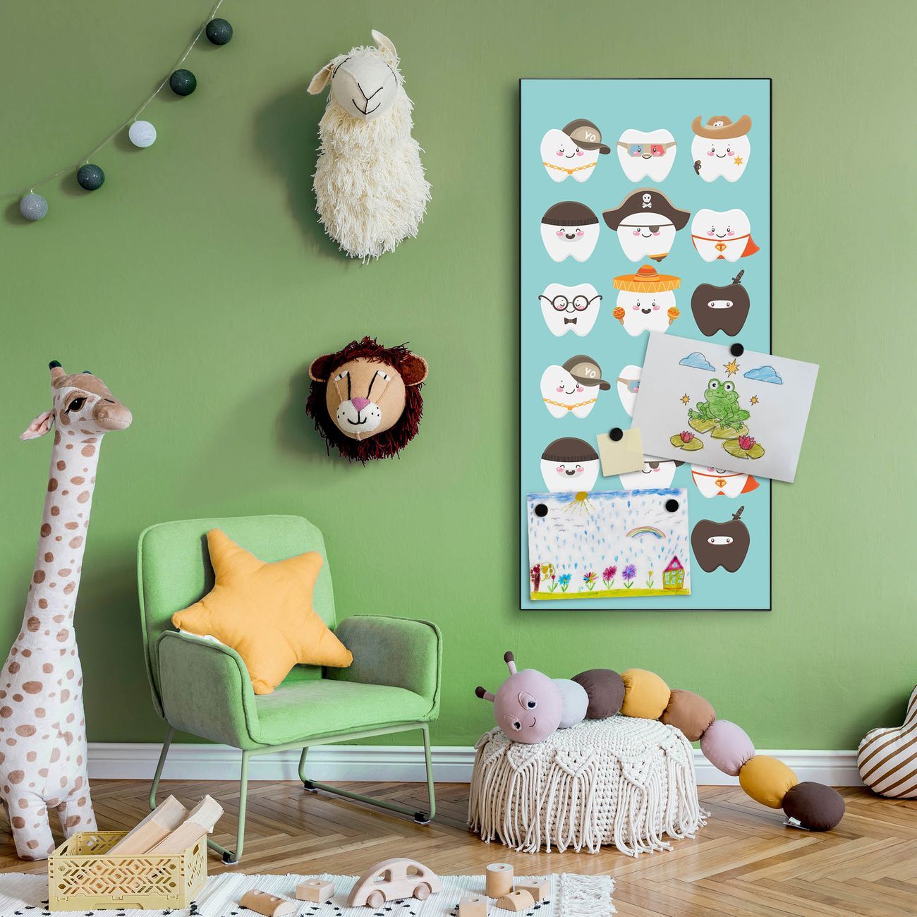 FUNKTION:  Die banjado Magnettafel mit Motiv Neun Zähne Motiv bringt Ordnung in Ihr Zettelchaos. Fotos, Termine, Notizen oder Rezepte lassen Sich hier stilvoll mit Magneten ordnen, Sie behalten alles im Blick. An der Design Magnettafel halten alle handesüblichen Magnete. DESIGN:  Die magnetische Pinnwand mit dem Motiv Motiv Neun Zähne ist ein eleganter Begleiter im Alltag. Mit dieser Memotafel aus Metall haben Sie auch ohne Notizen und Magnete ein schönes Dekoelement. Das Format bietet Ihnen ausreichend Platz um alle wichtigen Informationen im Blick zu behalten. DETAILS:  Die Magnettafel besteht aus silber-grau, weiß oder schwarzlackiertem Stahl. Sie hat eine Größe von 37 x 78 x 2cm. Es befinden sich auf der Rückseite vorgefertigte Aufhängungen die eine schnelle und unkomplizierte Anbringung ermöglichen. Das Motiv ist mit einem seidenmatten Laminat versehen und schützt so zusätzlich vor Kratzern. NUTZEN:  Sie können dieses Memoboard groß als Wandbild nutzen, es halten alle handelsüblichen Magneten daran. Die Pinnwand ist mit einem feuchten Lappen oder Schwamm abwischbar. Sie finden bei uns eine große Auswahl an passenden Magneten. BANJADO:  Wir sind ein kleines Team aus dem Herzen von Sachsen. Wir fertigen alle Artikel von Hand für Sie an, Sie erhalten keine preiswerte Importware. Auf Wunsch können Sie auch Ihr eigenes Foto auf die Magnettafel aufbringen, schreiben Sie uns an. Herzlichst, Ihr banjado-Team