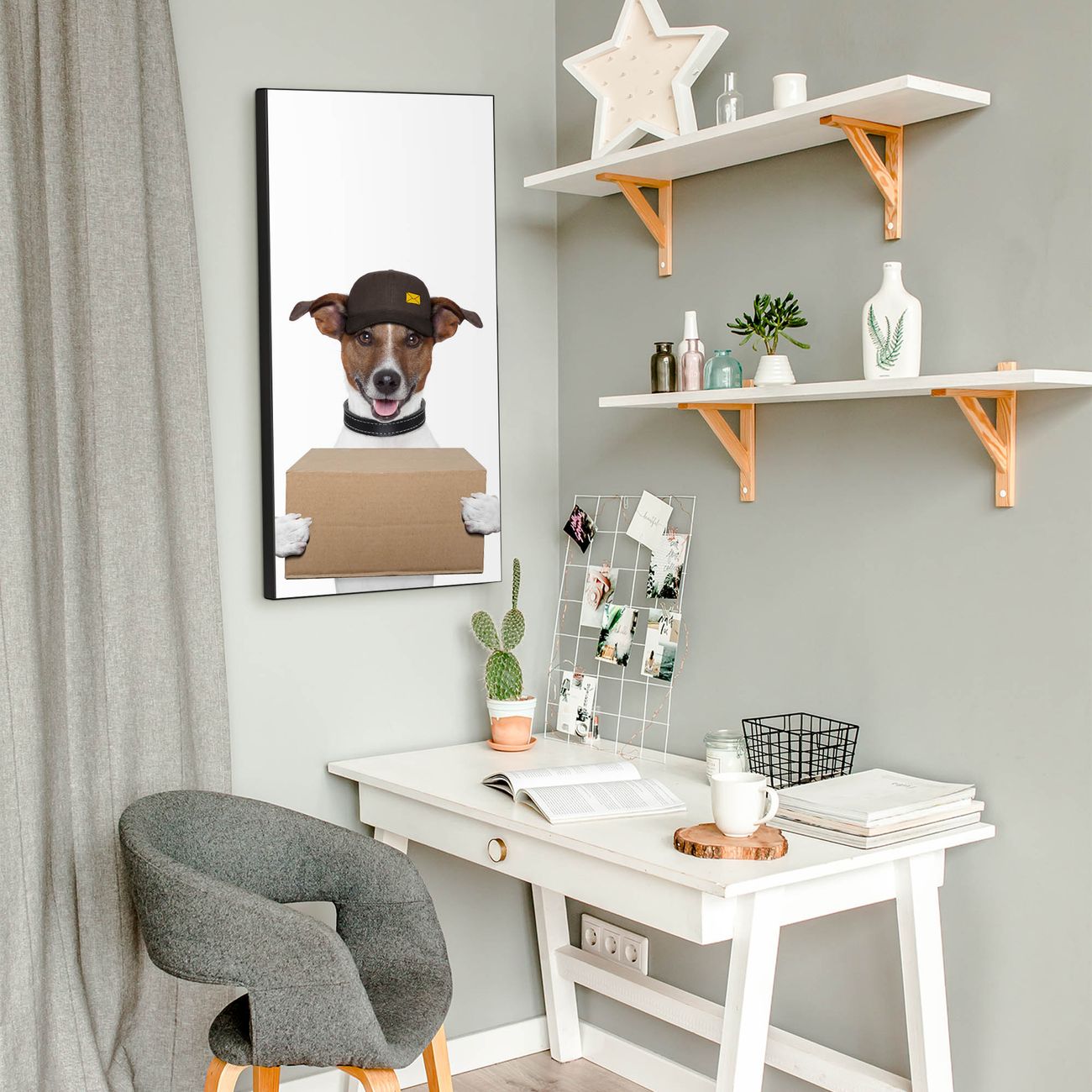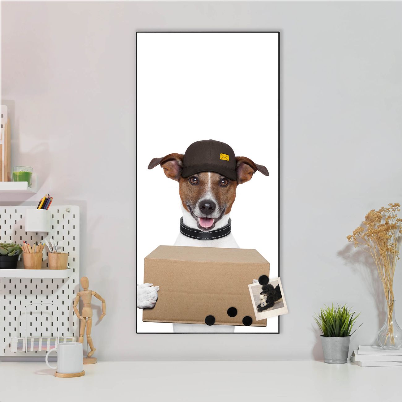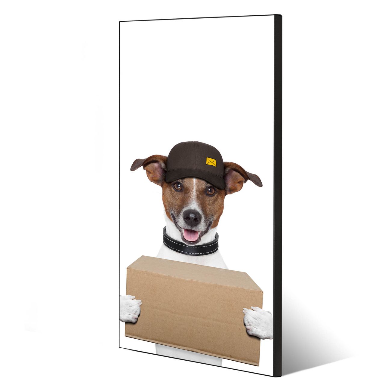 FUNKTION:  Die banjado Magnettafel mit Motiv Paketdienst Jack Russel Motiv bringt Ordnung in Ihr Zettelchaos. Fotos, Termine, Notizen oder Rezepte lassen Sich hier stilvoll mit Magneten ordnen, Sie behalten alles im Blick. An der Design Magnettafel halten alle handesüblichen Magnete. DESIGN:  Die magnetische Pinnwand mit dem Motiv Motiv Paketdienst Jack Russel ist ein eleganter Begleiter im Alltag. Mit dieser Memotafel aus Metall haben Sie auch ohne Notizen und Magnete ein schönes Dekoelement. Das Format bietet Ihnen ausreichend Platz um alle wichtigen Informationen im Blick zu behalten. DETAILS:  Die Magnettafel besteht aus silber-grau, weiß oder schwarzlackiertem Stahl. Sie hat eine Größe von 37 x 78 x 2cm. Es befinden sich auf der Rückseite vorgefertigte Aufhängungen die eine schnelle und unkomplizierte Anbringung ermöglichen. Das Motiv ist mit einem seidenmatten Laminat versehen und schützt so zusätzlich vor Kratzern. NUTZEN:  Sie können dieses Memoboard groß als Wandbild nutzen, es halten alle handelsüblichen Magneten daran. Die Pinnwand ist mit einem feuchten Lappen oder Schwamm abwischbar. Sie finden bei uns eine große Auswahl an passenden Magneten. BANJADO:  Wir sind ein kleines Team aus dem Herzen von Sachsen. Wir fertigen alle Artikel von Hand für Sie an, Sie erhalten keine preiswerte Importware. Auf Wunsch können Sie auch Ihr eigenes Foto auf die Magnettafel aufbringen, schreiben Sie uns an. Herzlichst, Ihr banjado-Team