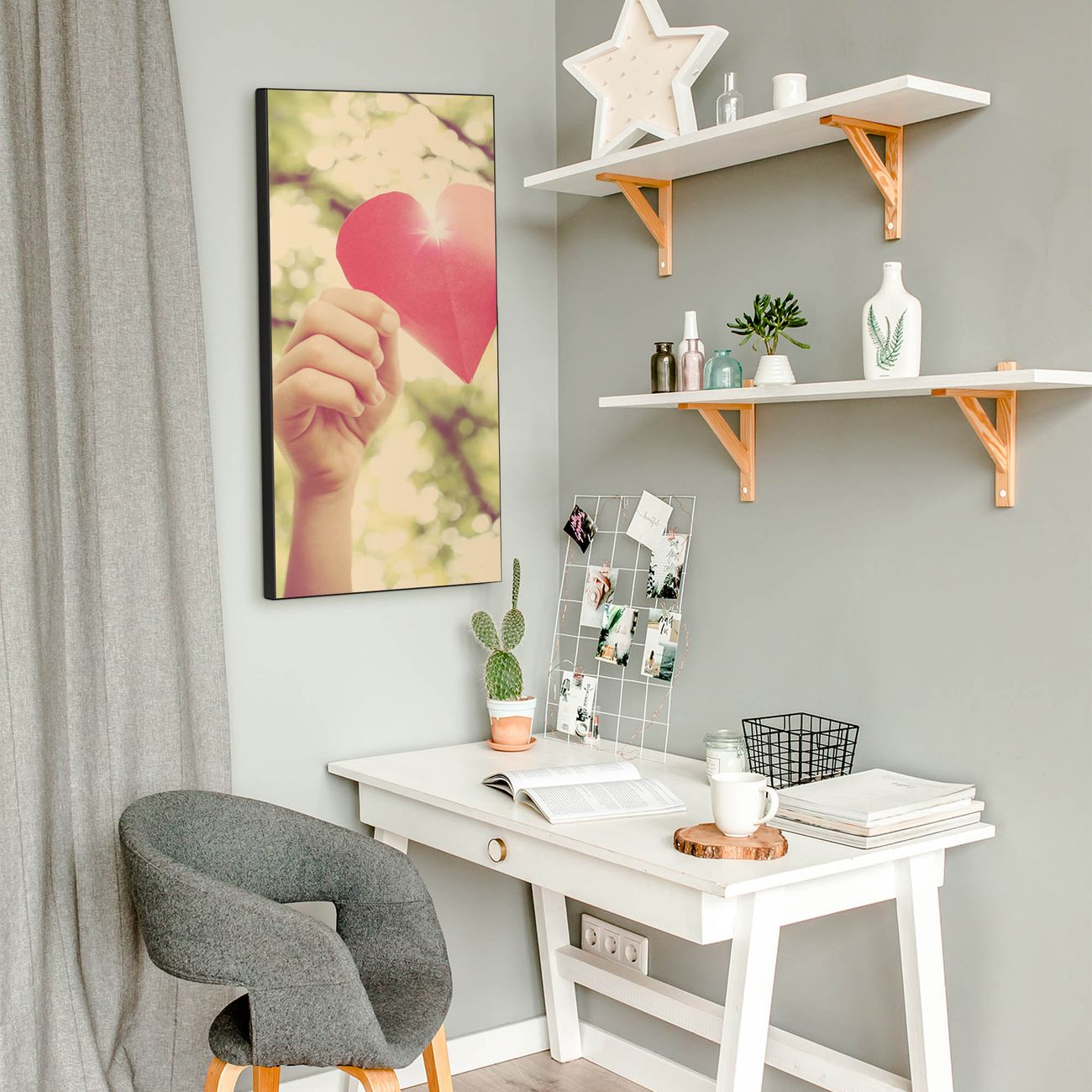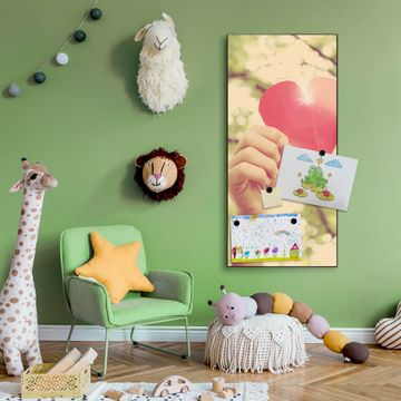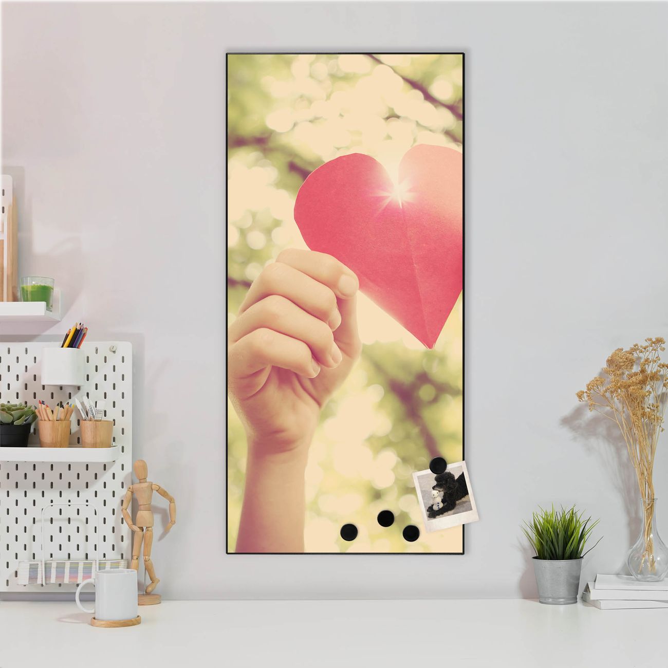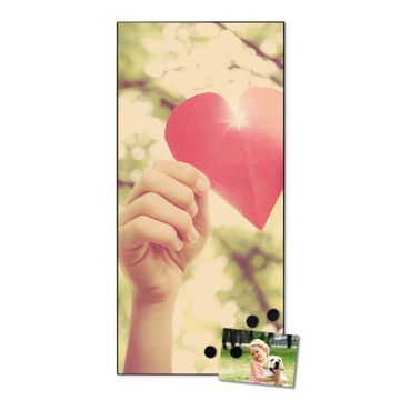 FUNKTION:  Die banjado Magnettafel mit Motiv Papierherz Motiv bringt Ordnung in Ihr Zettelchaos. Fotos, Termine, Notizen oder Rezepte lassen Sich hier stilvoll mit Magneten ordnen, Sie behalten alles im Blick. An der Design Magnettafel halten alle handesüblichen Magnete. DESIGN:  Die magnetische Pinnwand mit dem Motiv Motiv Papierherz ist ein eleganter Begleiter im Alltag. Mit dieser Memotafel aus Metall haben Sie auch ohne Notizen und Magnete ein schönes Dekoelement. Das Format bietet Ihnen ausreichend Platz um alle wichtigen Informationen im Blick zu behalten. DETAILS:  Die Magnettafel besteht aus silber-grau, weiß oder schwarzlackiertem Stahl. Sie hat eine Größe von 37 x 78 x 2cm. Es befinden sich auf der Rückseite vorgefertigte Aufhängungen die eine schnelle und unkomplizierte Anbringung ermöglichen. Das Motiv ist mit einem seidenmatten Laminat versehen und schützt so zusätzlich vor Kratzern. NUTZEN:  Sie können dieses Memoboard groß als Wandbild nutzen, es halten alle handelsüblichen Magneten daran. Die Pinnwand ist mit einem feuchten Lappen oder Schwamm abwischbar. Sie finden bei uns eine große Auswahl an passenden Magneten. BANJADO:  Wir sind ein kleines Team aus dem Herzen von Sachsen. Wir fertigen alle Artikel von Hand für Sie an, Sie erhalten keine preiswerte Importware. Auf Wunsch können Sie auch Ihr eigenes Foto auf die Magnettafel aufbringen, schreiben Sie uns an. Herzlichst, Ihr banjado-Team