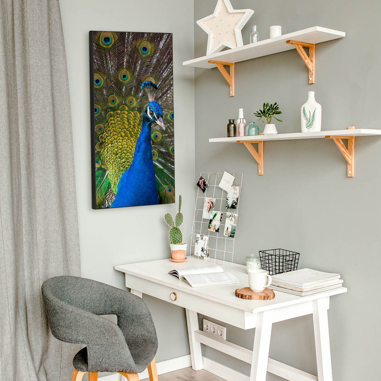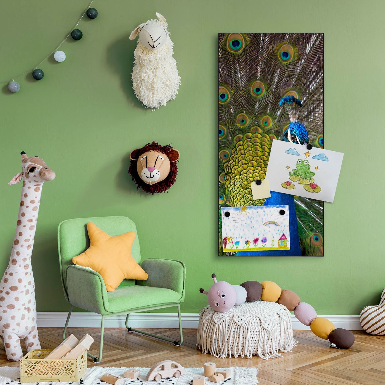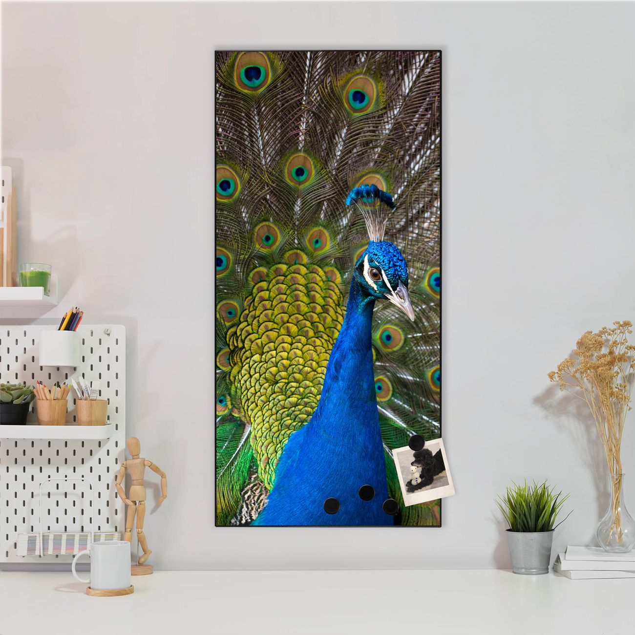 FUNKTION:  Die banjado Magnettafel mit Motiv Pfau Motiv bringt Ordnung in Ihr Zettelchaos. Fotos, Termine, Notizen oder Rezepte lassen Sich hier stilvoll mit Magneten ordnen, Sie behalten alles im Blick. An der Design Magnettafel halten alle handesüblichen Magnete. DESIGN:  Die magnetische Pinnwand mit dem Motiv Motiv Pfau ist ein eleganter Begleiter im Alltag. Mit dieser Memotafel aus Metall haben Sie auch ohne Notizen und Magnete ein schönes Dekoelement. Das Format bietet Ihnen ausreichend Platz um alle wichtigen Informationen im Blick zu behalten. DETAILS:  Die Magnettafel besteht aus silber-grau, weiß oder schwarzlackiertem Stahl. Sie hat eine Größe von 37 x 78 x 2cm. Es befinden sich auf der Rückseite vorgefertigte Aufhängungen die eine schnelle und unkomplizierte Anbringung ermöglichen. Das Motiv ist mit einem seidenmatten Laminat versehen und schützt so zusätzlich vor Kratzern. NUTZEN:  Sie können dieses Memoboard groß als Wandbild nutzen, es halten alle handelsüblichen Magneten daran. Die Pinnwand ist mit einem feuchten Lappen oder Schwamm abwischbar. Sie finden bei uns eine große Auswahl an passenden Magneten. BANJADO:  Wir sind ein kleines Team aus dem Herzen von Sachsen. Wir fertigen alle Artikel von Hand für Sie an, Sie erhalten keine preiswerte Importware. Auf Wunsch können Sie auch Ihr eigenes Foto auf die Magnettafel aufbringen, schreiben Sie uns an. Herzlichst, Ihr banjado-Team