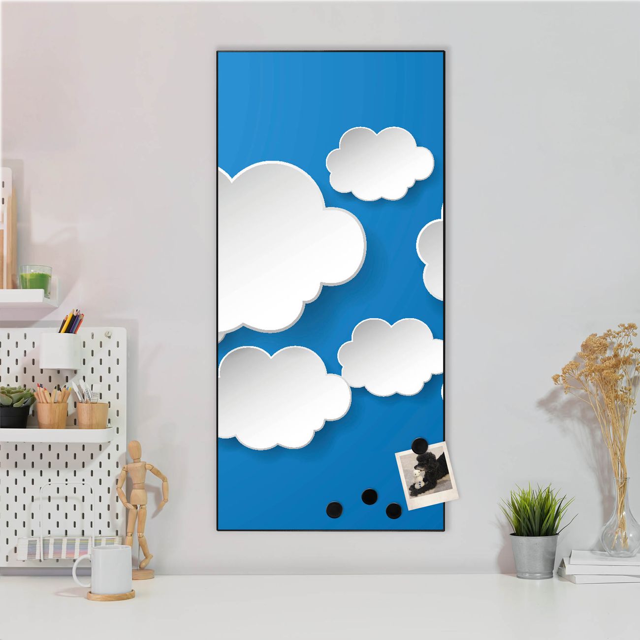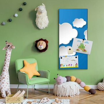 FUNKTION:  Die banjado Magnettafel mit Motiv Plastische Wolken Motiv bringt Ordnung in Ihr Zettelchaos. Fotos, Termine, Notizen oder Rezepte lassen Sich hier stilvoll mit Magneten ordnen, Sie behalten alles im Blick. An der Design Magnettafel halten alle handesüblichen Magnete. DESIGN:  Die magnetische Pinnwand mit dem Motiv Motiv Plastische Wolken ist ein eleganter Begleiter im Alltag. Mit dieser Memotafel aus Metall haben Sie auch ohne Notizen und Magnete ein schönes Dekoelement. Das Format bietet Ihnen ausreichend Platz um alle wichtigen Informationen im Blick zu behalten. DETAILS:  Die Magnettafel besteht aus silber-grau, weiß oder schwarzlackiertem Stahl. Sie hat eine Größe von 37 x 78 x 2cm. Es befinden sich auf der Rückseite vorgefertigte Aufhängungen die eine schnelle und unkomplizierte Anbringung ermöglichen. Das Motiv ist mit einem seidenmatten Laminat versehen und schützt so zusätzlich vor Kratzern. NUTZEN:  Sie können dieses Memoboard groß als Wandbild nutzen, es halten alle handelsüblichen Magneten daran. Die Pinnwand ist mit einem feuchten Lappen oder Schwamm abwischbar. Sie finden bei uns eine große Auswahl an passenden Magneten. BANJADO:  Wir sind ein kleines Team aus dem Herzen von Sachsen. Wir fertigen alle Artikel von Hand für Sie an, Sie erhalten keine preiswerte Importware. Auf Wunsch können Sie auch Ihr eigenes Foto auf die Magnettafel aufbringen, schreiben Sie uns an. Herzlichst, Ihr banjado-Team