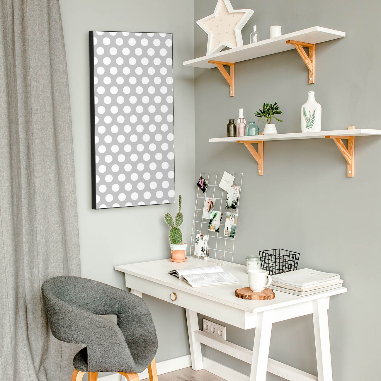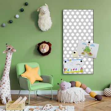 FUNKTION:  Die banjado Magnettafel mit Motiv Punkte Grau Motiv bringt Ordnung in Ihr Zettelchaos. Fotos, Termine, Notizen oder Rezepte lassen Sich hier stilvoll mit Magneten ordnen, Sie behalten alles im Blick. An der Design Magnettafel halten alle handesüblichen Magnete. DESIGN:  Die magnetische Pinnwand mit dem Motiv Motiv Punkte Grau ist ein eleganter Begleiter im Alltag. Mit dieser Memotafel aus Metall haben Sie auch ohne Notizen und Magnete ein schönes Dekoelement. Das Format bietet Ihnen ausreichend Platz um alle wichtigen Informationen im Blick zu behalten. DETAILS:  Die Magnettafel besteht aus silber-grau, weiß oder schwarzlackiertem Stahl. Sie hat eine Größe von 37 x 78 x 2cm. Es befinden sich auf der Rückseite vorgefertigte Aufhängungen die eine schnelle und unkomplizierte Anbringung ermöglichen. Das Motiv ist mit einem seidenmatten Laminat versehen und schützt so zusätzlich vor Kratzern. NUTZEN:  Sie können dieses Memoboard groß als Wandbild nutzen, es halten alle handelsüblichen Magneten daran. Die Pinnwand ist mit einem feuchten Lappen oder Schwamm abwischbar. Sie finden bei uns eine große Auswahl an passenden Magneten. BANJADO:  Wir sind ein kleines Team aus dem Herzen von Sachsen. Wir fertigen alle Artikel von Hand für Sie an, Sie erhalten keine preiswerte Importware. Auf Wunsch können Sie auch Ihr eigenes Foto auf die Magnettafel aufbringen, schreiben Sie uns an. Herzlichst, Ihr banjado-Team