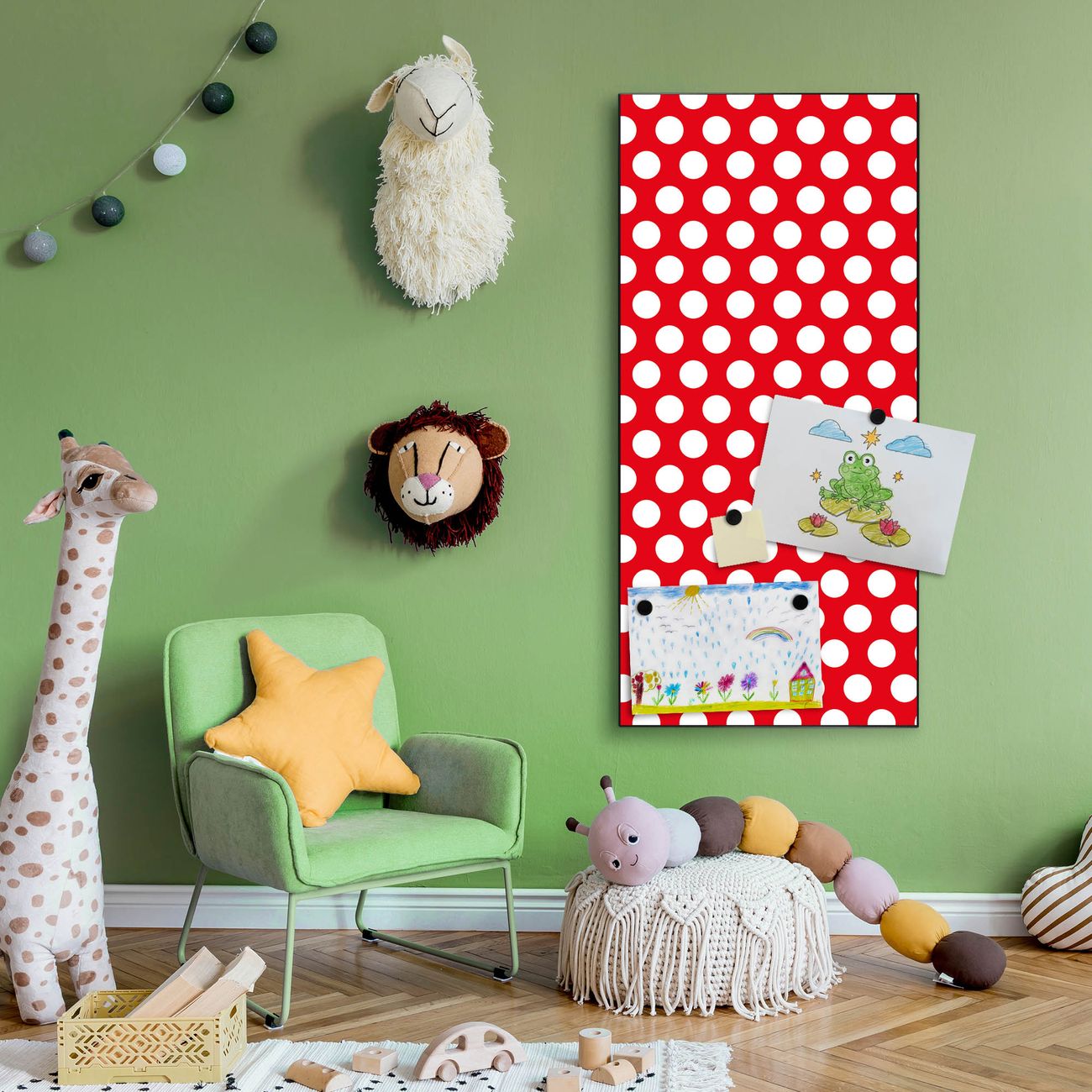 FUNKTION:  Die banjado Magnettafel mit Motiv Punkte Rot Motiv bringt Ordnung in Ihr Zettelchaos. Fotos, Termine, Notizen oder Rezepte lassen Sich hier stilvoll mit Magneten ordnen, Sie behalten alles im Blick. An der Design Magnettafel halten alle handesüblichen Magnete. DESIGN:  Die magnetische Pinnwand mit dem Motiv Motiv Punkte Rot ist ein eleganter Begleiter im Alltag. Mit dieser Memotafel aus Metall haben Sie auch ohne Notizen und Magnete ein schönes Dekoelement. Das Format bietet Ihnen ausreichend Platz um alle wichtigen Informationen im Blick zu behalten. DETAILS:  Die Magnettafel besteht aus silber-grau, weiß oder schwarzlackiertem Stahl. Sie hat eine Größe von 37 x 78 x 2cm. Es befinden sich auf der Rückseite vorgefertigte Aufhängungen die eine schnelle und unkomplizierte Anbringung ermöglichen. Das Motiv ist mit einem seidenmatten Laminat versehen und schützt so zusätzlich vor Kratzern. NUTZEN:  Sie können dieses Memoboard groß als Wandbild nutzen, es halten alle handelsüblichen Magneten daran. Die Pinnwand ist mit einem feuchten Lappen oder Schwamm abwischbar. Sie finden bei uns eine große Auswahl an passenden Magneten. BANJADO:  Wir sind ein kleines Team aus dem Herzen von Sachsen. Wir fertigen alle Artikel von Hand für Sie an, Sie erhalten keine preiswerte Importware. Auf Wunsch können Sie auch Ihr eigenes Foto auf die Magnettafel aufbringen, schreiben Sie uns an. Herzlichst, Ihr banjado-Team
