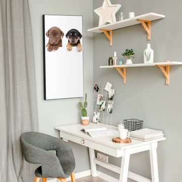 FUNKTION:  Die banjado Magnettafel mit Motiv Puppies Motiv bringt Ordnung in Ihr Zettelchaos. Fotos, Termine, Notizen oder Rezepte lassen Sich hier stilvoll mit Magneten ordnen, Sie behalten alles im Blick. An der Design Magnettafel halten alle handesüblichen Magnete. DESIGN:  Die magnetische Pinnwand mit dem Motiv Motiv Puppies ist ein eleganter Begleiter im Alltag. Mit dieser Memotafel aus Metall haben Sie auch ohne Notizen und Magnete ein schönes Dekoelement. Das Format bietet Ihnen ausreichend Platz um alle wichtigen Informationen im Blick zu behalten. DETAILS:  Die Magnettafel besteht aus silber-grau, weiß oder schwarzlackiertem Stahl. Sie hat eine Größe von 37 x 78 x 2cm. Es befinden sich auf der Rückseite vorgefertigte Aufhängungen die eine schnelle und unkomplizierte Anbringung ermöglichen. Das Motiv ist mit einem seidenmatten Laminat versehen und schützt so zusätzlich vor Kratzern. NUTZEN:  Sie können dieses Memoboard groß als Wandbild nutzen, es halten alle handelsüblichen Magneten daran. Die Pinnwand ist mit einem feuchten Lappen oder Schwamm abwischbar. Sie finden bei uns eine große Auswahl an passenden Magneten. BANJADO:  Wir sind ein kleines Team aus dem Herzen von Sachsen. Wir fertigen alle Artikel von Hand für Sie an, Sie erhalten keine preiswerte Importware. Auf Wunsch können Sie auch Ihr eigenes Foto auf die Magnettafel aufbringen, schreiben Sie uns an. Herzlichst, Ihr banjado-Team