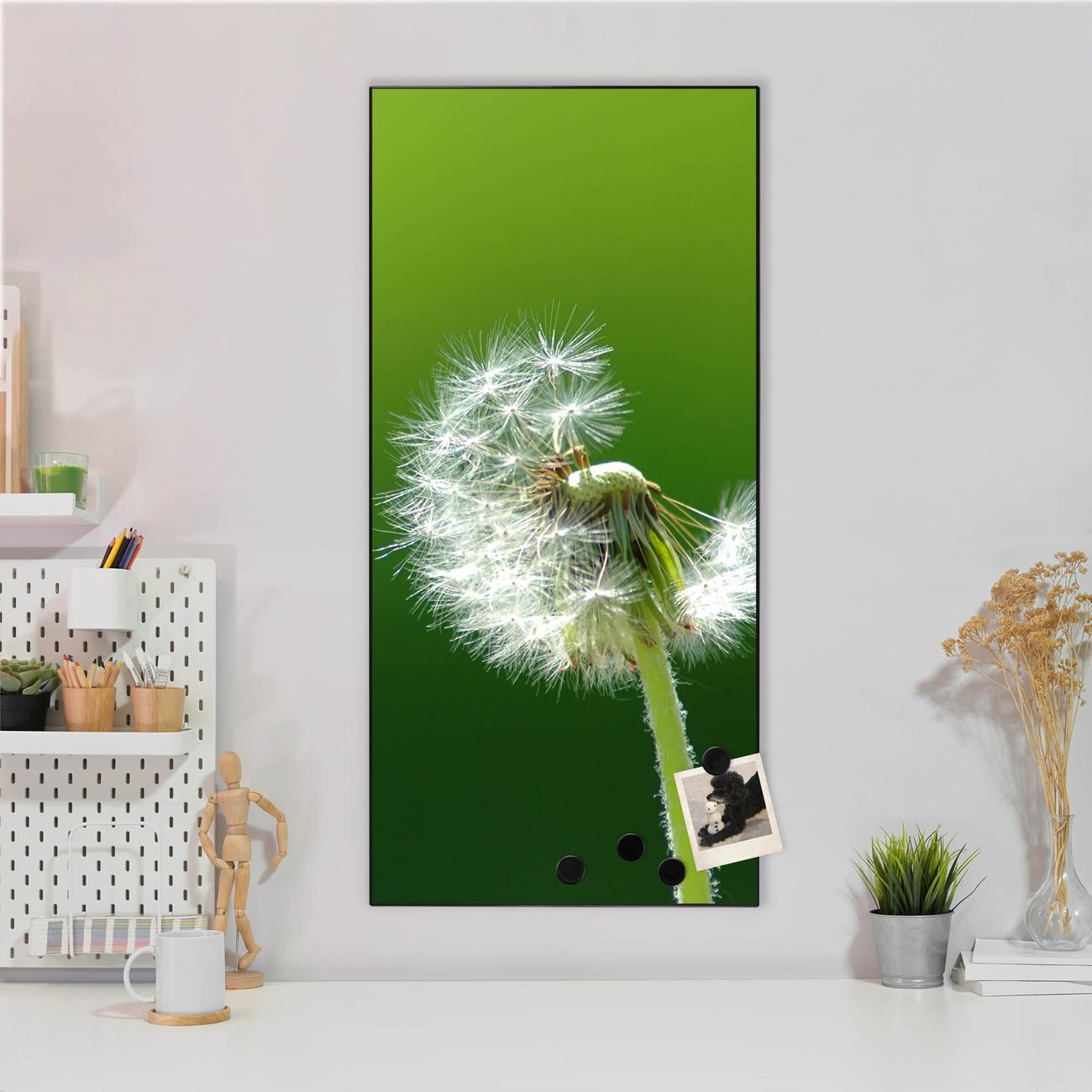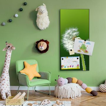 FUNKTION:  Die banjado Magnettafel mit Motiv Pusteblume Motiv bringt Ordnung in Ihr Zettelchaos. Fotos, Termine, Notizen oder Rezepte lassen Sich hier stilvoll mit Magneten ordnen, Sie behalten alles im Blick. An der Design Magnettafel halten alle handesüblichen Magnete. DESIGN:  Die magnetische Pinnwand mit dem Motiv Motiv Pusteblume ist ein eleganter Begleiter im Alltag. Mit dieser Memotafel aus Metall haben Sie auch ohne Notizen und Magnete ein schönes Dekoelement. Das Format bietet Ihnen ausreichend Platz um alle wichtigen Informationen im Blick zu behalten. DETAILS:  Die Magnettafel besteht aus silber-grau, weiß oder schwarzlackiertem Stahl. Sie hat eine Größe von 37 x 78 x 2cm. Es befinden sich auf der Rückseite vorgefertigte Aufhängungen die eine schnelle und unkomplizierte Anbringung ermöglichen. Das Motiv ist mit einem seidenmatten Laminat versehen und schützt so zusätzlich vor Kratzern. NUTZEN:  Sie können dieses Memoboard groß als Wandbild nutzen, es halten alle handelsüblichen Magneten daran. Die Pinnwand ist mit einem feuchten Lappen oder Schwamm abwischbar. Sie finden bei uns eine große Auswahl an passenden Magneten. BANJADO:  Wir sind ein kleines Team aus dem Herzen von Sachsen. Wir fertigen alle Artikel von Hand für Sie an, Sie erhalten keine preiswerte Importware. Auf Wunsch können Sie auch Ihr eigenes Foto auf die Magnettafel aufbringen, schreiben Sie uns an. Herzlichst, Ihr banjado-Team