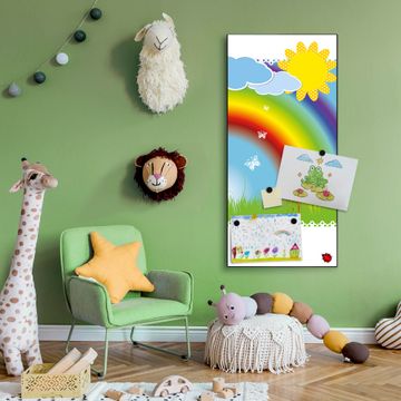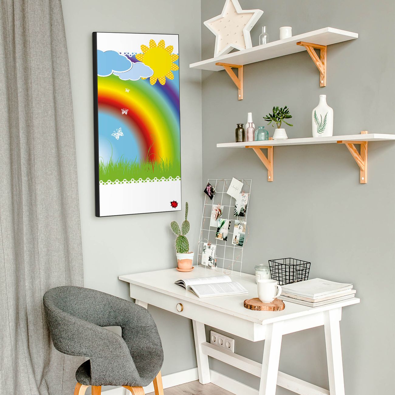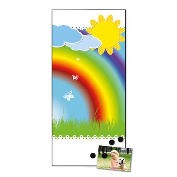 FUNKTION:  Die banjado Magnettafel mit Motiv Regenbogen Motiv bringt Ordnung in Ihr Zettelchaos. Fotos, Termine, Notizen oder Rezepte lassen Sich hier stilvoll mit Magneten ordnen, Sie behalten alles im Blick. An der Design Magnettafel halten alle handesüblichen Magnete. DESIGN:  Die magnetische Pinnwand mit dem Motiv Motiv Regenbogen ist ein eleganter Begleiter im Alltag. Mit dieser Memotafel aus Metall haben Sie auch ohne Notizen und Magnete ein schönes Dekoelement. Das Format bietet Ihnen ausreichend Platz um alle wichtigen Informationen im Blick zu behalten. DETAILS:  Die Magnettafel besteht aus silber-grau, weiß oder schwarzlackiertem Stahl. Sie hat eine Größe von 37 x 78 x 2cm. Es befinden sich auf der Rückseite vorgefertigte Aufhängungen die eine schnelle und unkomplizierte Anbringung ermöglichen. Das Motiv ist mit einem seidenmatten Laminat versehen und schützt so zusätzlich vor Kratzern. NUTZEN:  Sie können dieses Memoboard groß als Wandbild nutzen, es halten alle handelsüblichen Magneten daran. Die Pinnwand ist mit einem feuchten Lappen oder Schwamm abwischbar. Sie finden bei uns eine große Auswahl an passenden Magneten. BANJADO:  Wir sind ein kleines Team aus dem Herzen von Sachsen. Wir fertigen alle Artikel von Hand für Sie an, Sie erhalten keine preiswerte Importware. Auf Wunsch können Sie auch Ihr eigenes Foto auf die Magnettafel aufbringen, schreiben Sie uns an. Herzlichst, Ihr banjado-Team