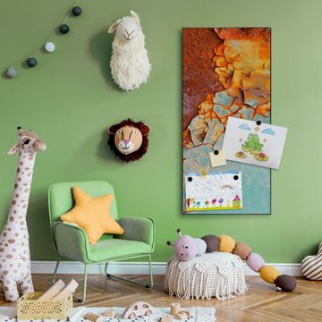 FUNKTION:  Die banjado Magnettafel mit Motiv Rost und Blau Motiv bringt Ordnung in Ihr Zettelchaos. Fotos, Termine, Notizen oder Rezepte lassen Sich hier stilvoll mit Magneten ordnen, Sie behalten alles im Blick. An der Design Magnettafel halten alle handesüblichen Magnete. DESIGN:  Die magnetische Pinnwand mit dem Motiv Motiv Rost und Blau ist ein eleganter Begleiter im Alltag. Mit dieser Memotafel aus Metall haben Sie auch ohne Notizen und Magnete ein schönes Dekoelement. Das Format bietet Ihnen ausreichend Platz um alle wichtigen Informationen im Blick zu behalten. DETAILS:  Die Magnettafel besteht aus silber-grau, weiß oder schwarzlackiertem Stahl. Sie hat eine Größe von 37 x 78 x 2cm. Es befinden sich auf der Rückseite vorgefertigte Aufhängungen die eine schnelle und unkomplizierte Anbringung ermöglichen. Das Motiv ist mit einem seidenmatten Laminat versehen und schützt so zusätzlich vor Kratzern. NUTZEN:  Sie können dieses Memoboard groß als Wandbild nutzen, es halten alle handelsüblichen Magneten daran. Die Pinnwand ist mit einem feuchten Lappen oder Schwamm abwischbar. Sie finden bei uns eine große Auswahl an passenden Magneten. BANJADO:  Wir sind ein kleines Team aus dem Herzen von Sachsen. Wir fertigen alle Artikel von Hand für Sie an, Sie erhalten keine preiswerte Importware. Auf Wunsch können Sie auch Ihr eigenes Foto auf die Magnettafel aufbringen, schreiben Sie uns an. Herzlichst, Ihr banjado-Team