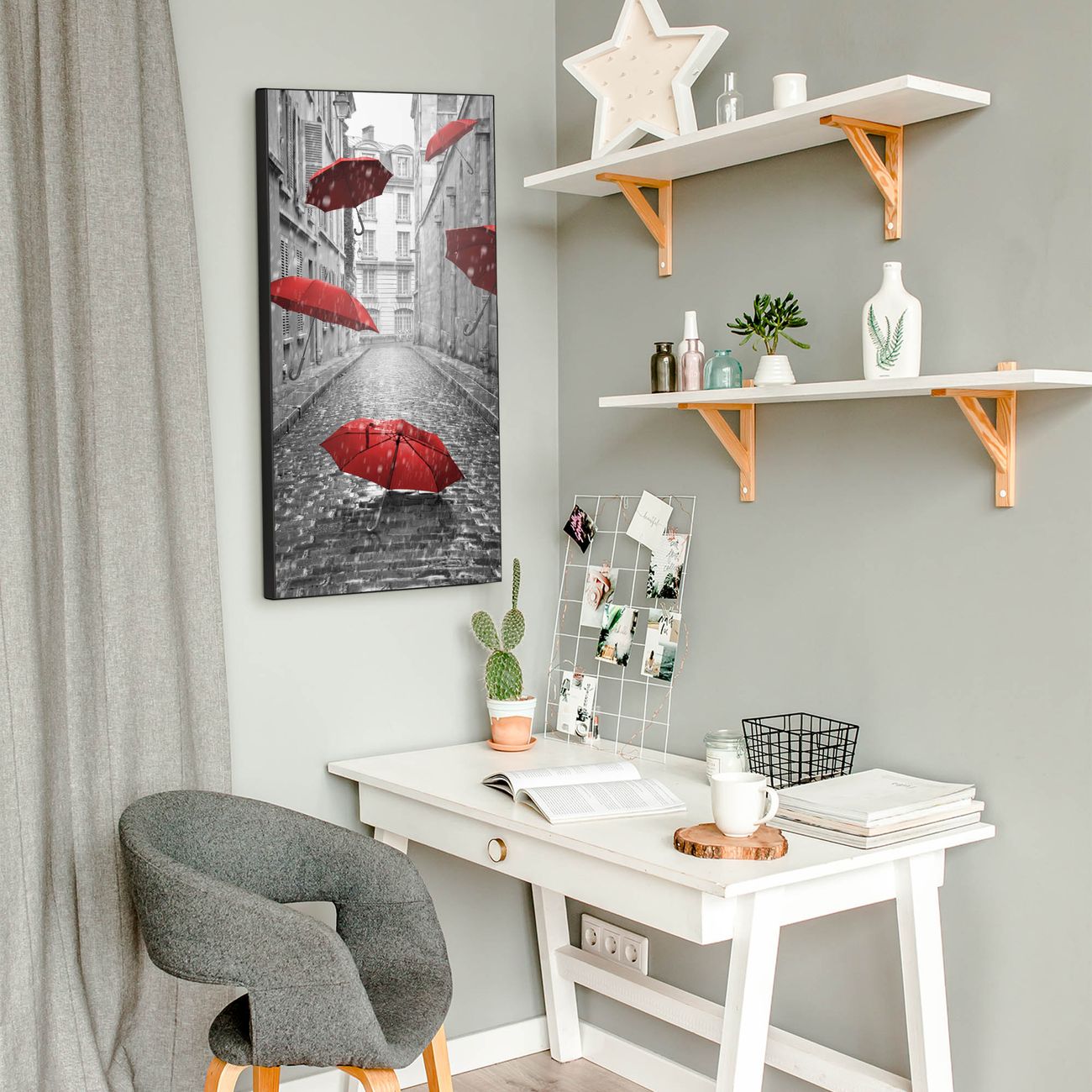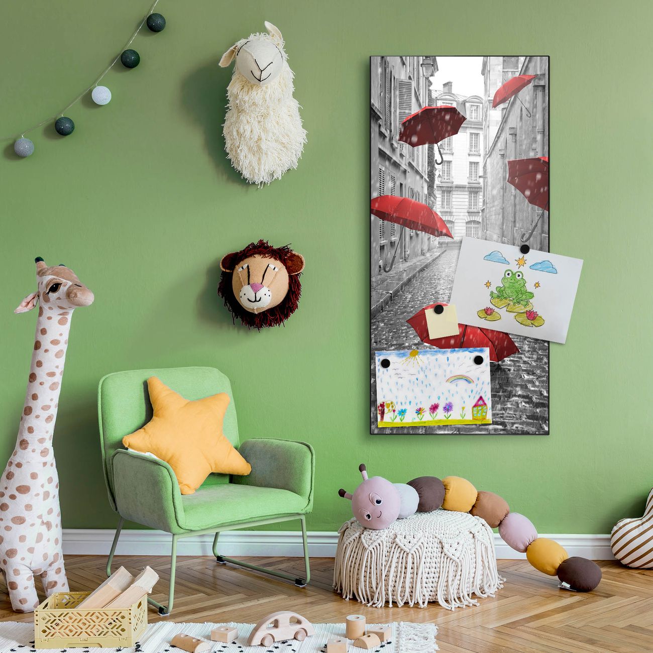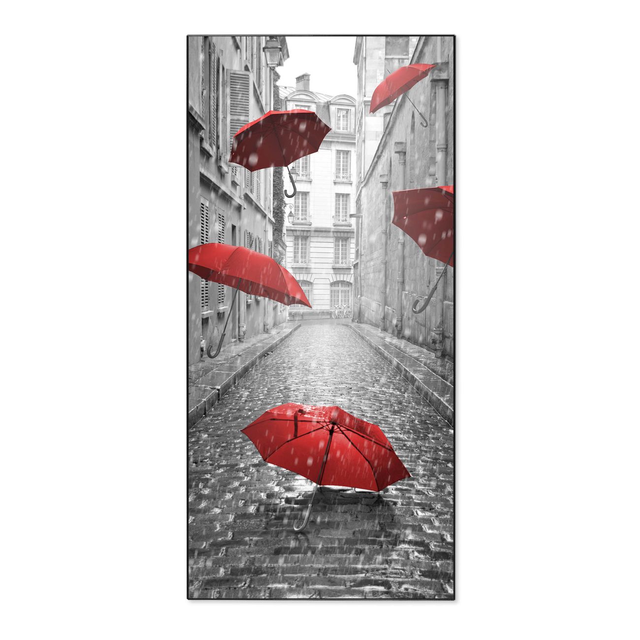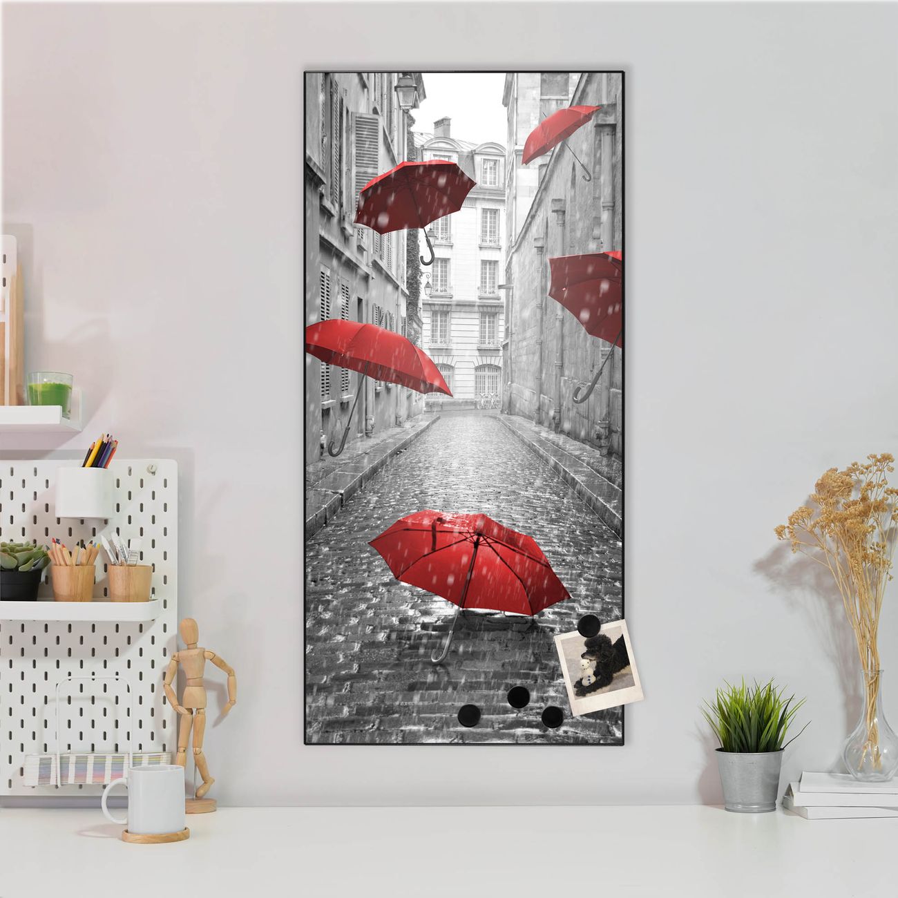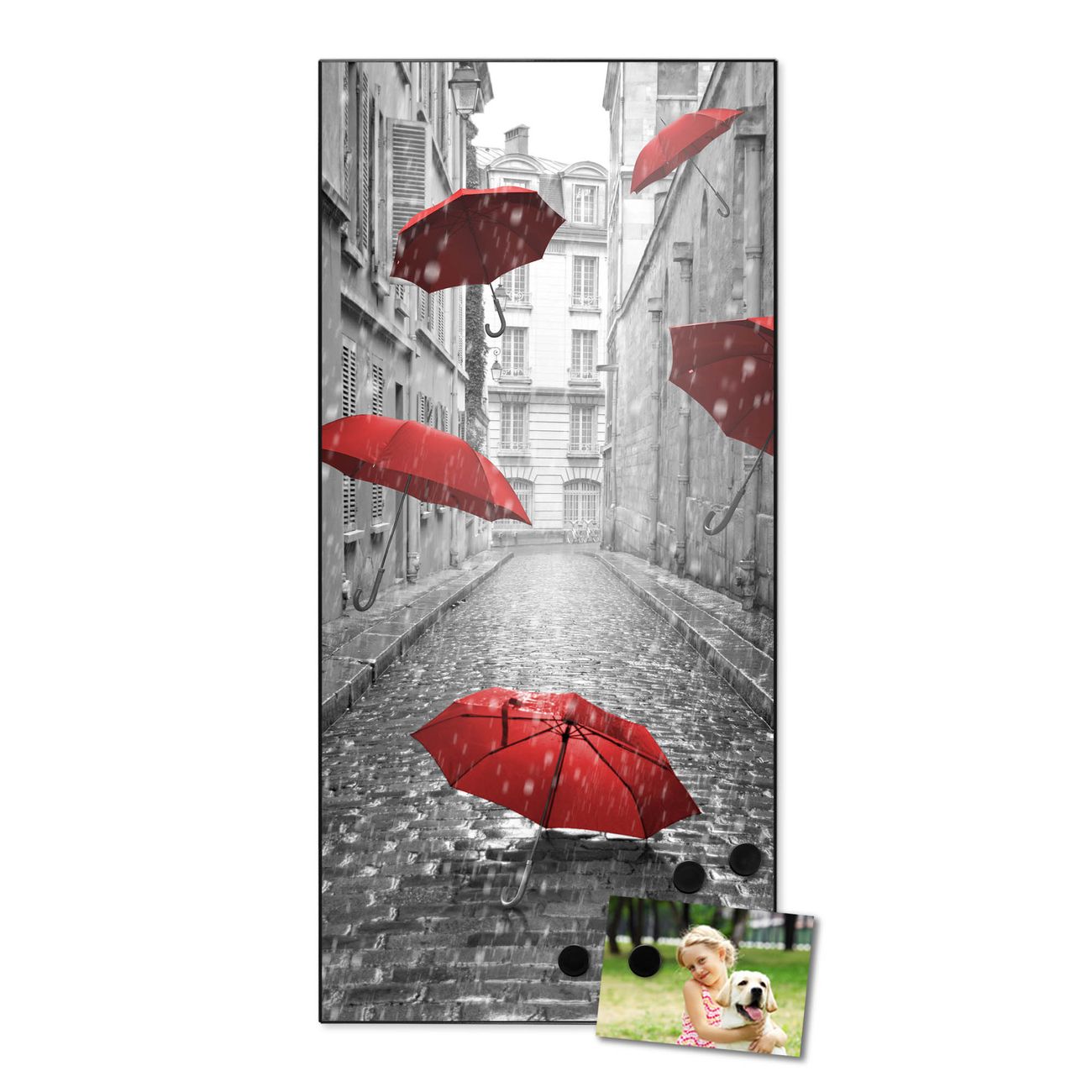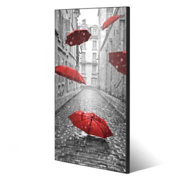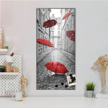 FUNKTION:  Die banjado Magnettafel mit Motiv Rote Schirme Motiv bringt Ordnung in Ihr Zettelchaos. Fotos, Termine, Notizen oder Rezepte lassen Sich hier stilvoll mit Magneten ordnen, Sie behalten alles im Blick. An der Design Magnettafel halten alle handesüblichen Magnete. DESIGN:  Die magnetische Pinnwand mit dem Motiv Motiv Rote Schirme ist ein eleganter Begleiter im Alltag. Mit dieser Memotafel aus Metall haben Sie auch ohne Notizen und Magnete ein schönes Dekoelement. Das Format bietet Ihnen ausreichend Platz um alle wichtigen Informationen im Blick zu behalten. DETAILS:  Die Magnettafel besteht aus silber-grau, weiß oder schwarzlackiertem Stahl. Sie hat eine Größe von 37 x 78 x 2cm. Es befinden sich auf der Rückseite vorgefertigte Aufhängungen die eine schnelle und unkomplizierte Anbringung ermöglichen. Das Motiv ist mit einem seidenmatten Laminat versehen und schützt so zusätzlich vor Kratzern. NUTZEN:  Sie können dieses Memoboard groß als Wandbild nutzen, es halten alle handelsüblichen Magneten daran. Die Pinnwand ist mit einem feuchten Lappen oder Schwamm abwischbar. Sie finden bei uns eine große Auswahl an passenden Magneten. BANJADO:  Wir sind ein kleines Team aus dem Herzen von Sachsen. Wir fertigen alle Artikel von Hand für Sie an, Sie erhalten keine preiswerte Importware. Auf Wunsch können Sie auch Ihr eigenes Foto auf die Magnettafel aufbringen, schreiben Sie uns an. Herzlichst, Ihr banjado-Team
