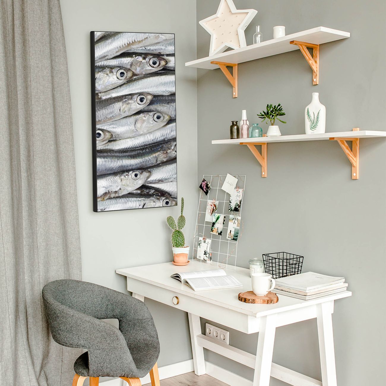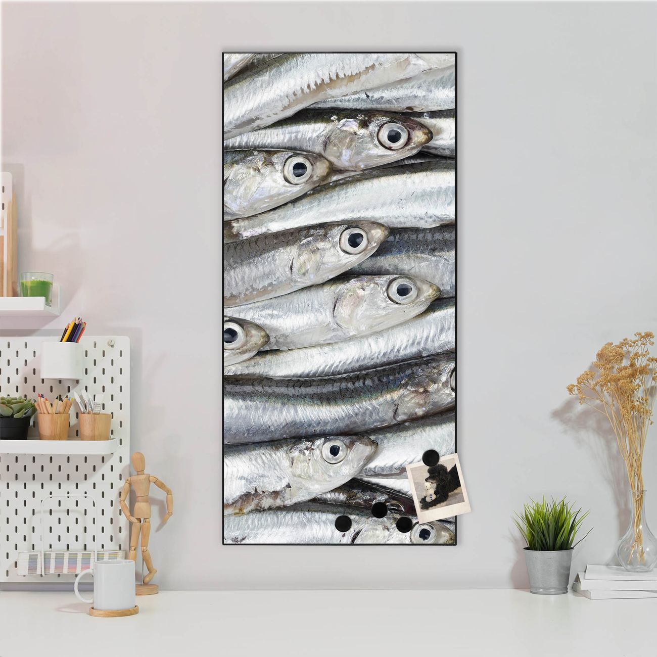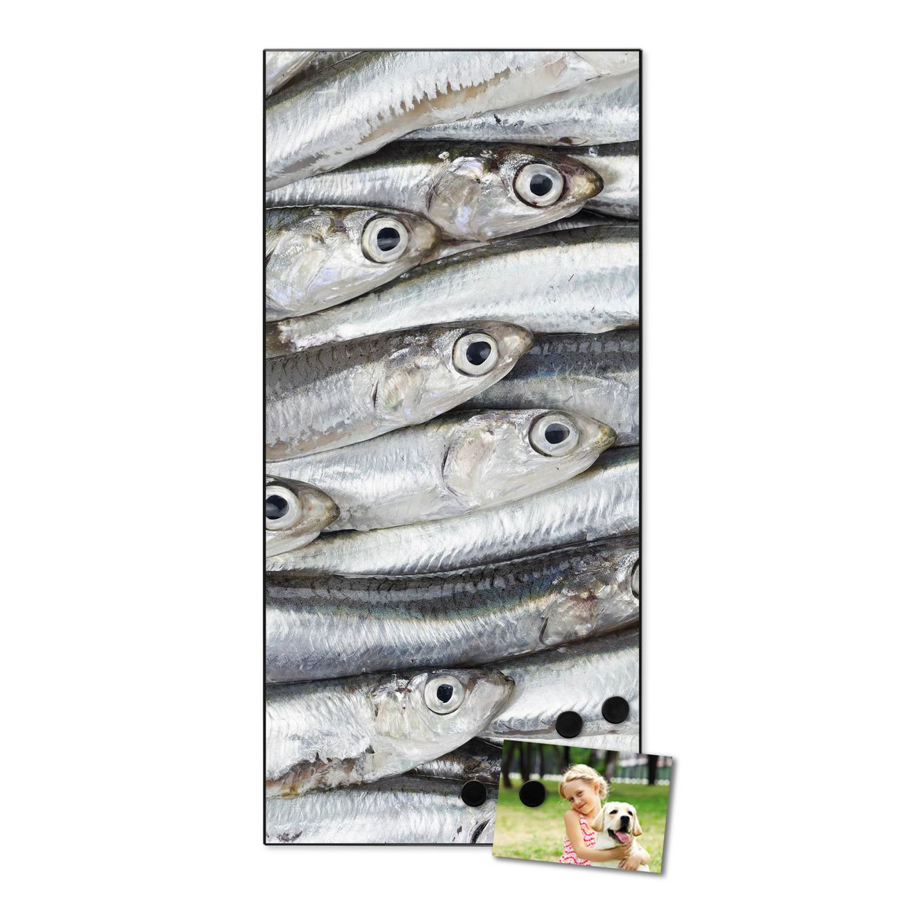 FUNKTION:  Die banjado Magnettafel mit Motiv Sardinen Motiv bringt Ordnung in Ihr Zettelchaos. Fotos, Termine, Notizen oder Rezepte lassen Sich hier stilvoll mit Magneten ordnen, Sie behalten alles im Blick. An der Design Magnettafel halten alle handesüblichen Magnete. DESIGN:  Die magnetische Pinnwand mit dem Motiv Motiv Sardinen ist ein eleganter Begleiter im Alltag. Mit dieser Memotafel aus Metall haben Sie auch ohne Notizen und Magnete ein schönes Dekoelement. Das Format bietet Ihnen ausreichend Platz um alle wichtigen Informationen im Blick zu behalten. DETAILS:  Die Magnettafel besteht aus silber-grau, weiß oder schwarzlackiertem Stahl. Sie hat eine Größe von 37 x 78 x 2cm. Es befinden sich auf der Rückseite vorgefertigte Aufhängungen die eine schnelle und unkomplizierte Anbringung ermöglichen. Das Motiv ist mit einem seidenmatten Laminat versehen und schützt so zusätzlich vor Kratzern. NUTZEN:  Sie können dieses Memoboard groß als Wandbild nutzen, es halten alle handelsüblichen Magneten daran. Die Pinnwand ist mit einem feuchten Lappen oder Schwamm abwischbar. Sie finden bei uns eine große Auswahl an passenden Magneten. BANJADO:  Wir sind ein kleines Team aus dem Herzen von Sachsen. Wir fertigen alle Artikel von Hand für Sie an, Sie erhalten keine preiswerte Importware. Auf Wunsch können Sie auch Ihr eigenes Foto auf die Magnettafel aufbringen, schreiben Sie uns an. Herzlichst, Ihr banjado-Team