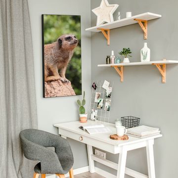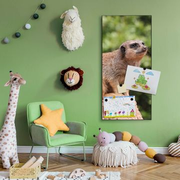 FUNKTION:  Die banjado Magnettafel mit Motiv Sitzendes Erdmännchen Motiv bringt Ordnung in Ihr Zettelchaos. Fotos, Termine, Notizen oder Rezepte lassen Sich hier stilvoll mit Magneten ordnen, Sie behalten alles im Blick. An der Design Magnettafel halten alle handesüblichen Magnete. DESIGN:  Die magnetische Pinnwand mit dem Motiv Motiv Sitzendes Erdmännchen ist ein eleganter Begleiter im Alltag. Mit dieser Memotafel aus Metall haben Sie auch ohne Notizen und Magnete ein schönes Dekoelement. Das Format bietet Ihnen ausreichend Platz um alle wichtigen Informationen im Blick zu behalten. DETAILS:  Die Magnettafel besteht aus silber-grau, weiß oder schwarzlackiertem Stahl. Sie hat eine Größe von 37 x 78 x 2cm. Es befinden sich auf der Rückseite vorgefertigte Aufhängungen die eine schnelle und unkomplizierte Anbringung ermöglichen. Das Motiv ist mit einem seidenmatten Laminat versehen und schützt so zusätzlich vor Kratzern. NUTZEN:  Sie können dieses Memoboard groß als Wandbild nutzen, es halten alle handelsüblichen Magneten daran. Die Pinnwand ist mit einem feuchten Lappen oder Schwamm abwischbar. Sie finden bei uns eine große Auswahl an passenden Magneten. BANJADO:  Wir sind ein kleines Team aus dem Herzen von Sachsen. Wir fertigen alle Artikel von Hand für Sie an, Sie erhalten keine preiswerte Importware. Auf Wunsch können Sie auch Ihr eigenes Foto auf die Magnettafel aufbringen, schreiben Sie uns an. Herzlichst, Ihr banjado-Team