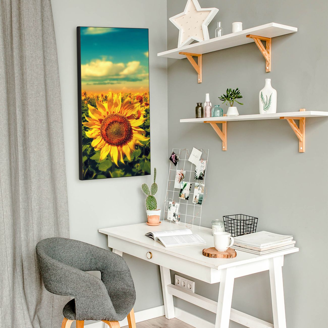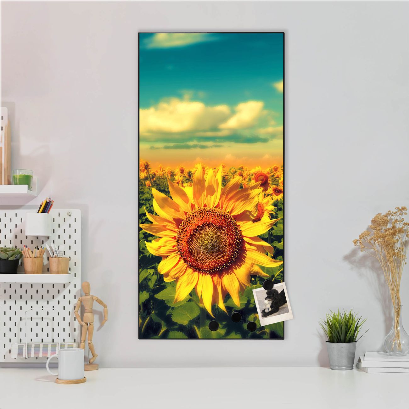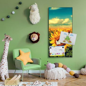 FUNKTION:  Die banjado Magnettafel mit Motiv Sonnenblumen Motiv bringt Ordnung in Ihr Zettelchaos. Fotos, Termine, Notizen oder Rezepte lassen Sich hier stilvoll mit Magneten ordnen, Sie behalten alles im Blick. An der Design Magnettafel halten alle handesüblichen Magnete. DESIGN:  Die magnetische Pinnwand mit dem Motiv Motiv Sonnenblumen ist ein eleganter Begleiter im Alltag. Mit dieser Memotafel aus Metall haben Sie auch ohne Notizen und Magnete ein schönes Dekoelement. Das Format bietet Ihnen ausreichend Platz um alle wichtigen Informationen im Blick zu behalten. DETAILS:  Die Magnettafel besteht aus silber-grau, weiß oder schwarzlackiertem Stahl. Sie hat eine Größe von 37 x 78 x 2cm. Es befinden sich auf der Rückseite vorgefertigte Aufhängungen die eine schnelle und unkomplizierte Anbringung ermöglichen. Das Motiv ist mit einem seidenmatten Laminat versehen und schützt so zusätzlich vor Kratzern. NUTZEN:  Sie können dieses Memoboard groß als Wandbild nutzen, es halten alle handelsüblichen Magneten daran. Die Pinnwand ist mit einem feuchten Lappen oder Schwamm abwischbar. Sie finden bei uns eine große Auswahl an passenden Magneten. BANJADO:  Wir sind ein kleines Team aus dem Herzen von Sachsen. Wir fertigen alle Artikel von Hand für Sie an, Sie erhalten keine preiswerte Importware. Auf Wunsch können Sie auch Ihr eigenes Foto auf die Magnettafel aufbringen, schreiben Sie uns an. Herzlichst, Ihr banjado-Team