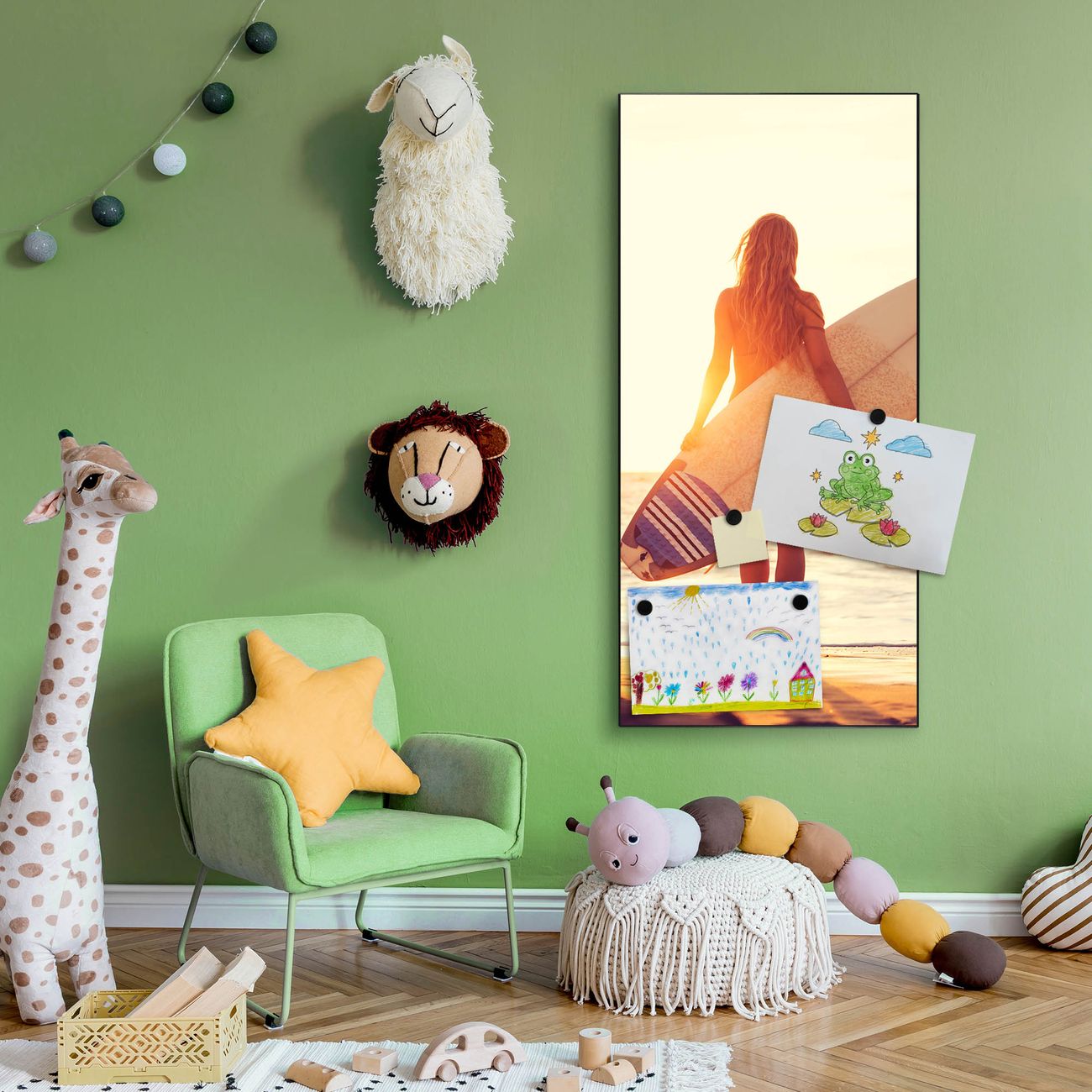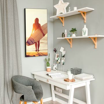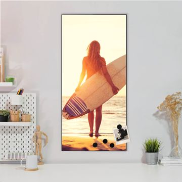 FUNKTION:  Die banjado Magnettafel mit Motiv Surfer Girl Motiv bringt Ordnung in Ihr Zettelchaos. Fotos, Termine, Notizen oder Rezepte lassen Sich hier stilvoll mit Magneten ordnen, Sie behalten alles im Blick. An der Design Magnettafel halten alle handesüblichen Magnete. DESIGN:  Die magnetische Pinnwand mit dem Motiv Motiv Surfer Girl ist ein eleganter Begleiter im Alltag. Mit dieser Memotafel aus Metall haben Sie auch ohne Notizen und Magnete ein schönes Dekoelement. Das Format bietet Ihnen ausreichend Platz um alle wichtigen Informationen im Blick zu behalten. DETAILS:  Die Magnettafel besteht aus silber-grau, weiß oder schwarzlackiertem Stahl. Sie hat eine Größe von 37 x 78 x 2cm. Es befinden sich auf der Rückseite vorgefertigte Aufhängungen die eine schnelle und unkomplizierte Anbringung ermöglichen. Das Motiv ist mit einem seidenmatten Laminat versehen und schützt so zusätzlich vor Kratzern. NUTZEN:  Sie können dieses Memoboard groß als Wandbild nutzen, es halten alle handelsüblichen Magneten daran. Die Pinnwand ist mit einem feuchten Lappen oder Schwamm abwischbar. Sie finden bei uns eine große Auswahl an passenden Magneten. BANJADO:  Wir sind ein kleines Team aus dem Herzen von Sachsen. Wir fertigen alle Artikel von Hand für Sie an, Sie erhalten keine preiswerte Importware. Auf Wunsch können Sie auch Ihr eigenes Foto auf die Magnettafel aufbringen, schreiben Sie uns an. Herzlichst, Ihr banjado-Team