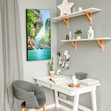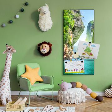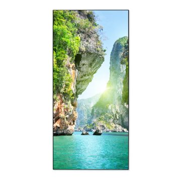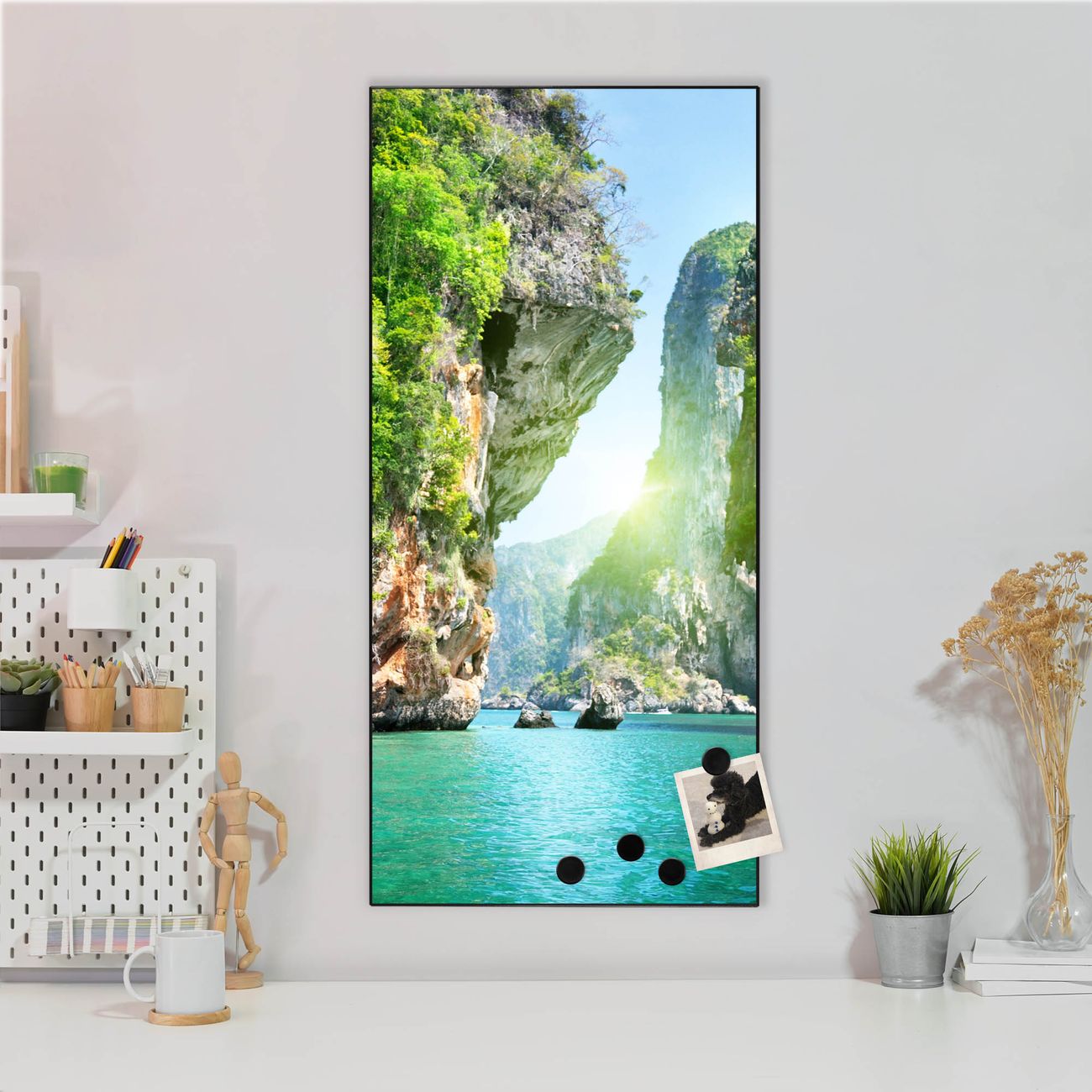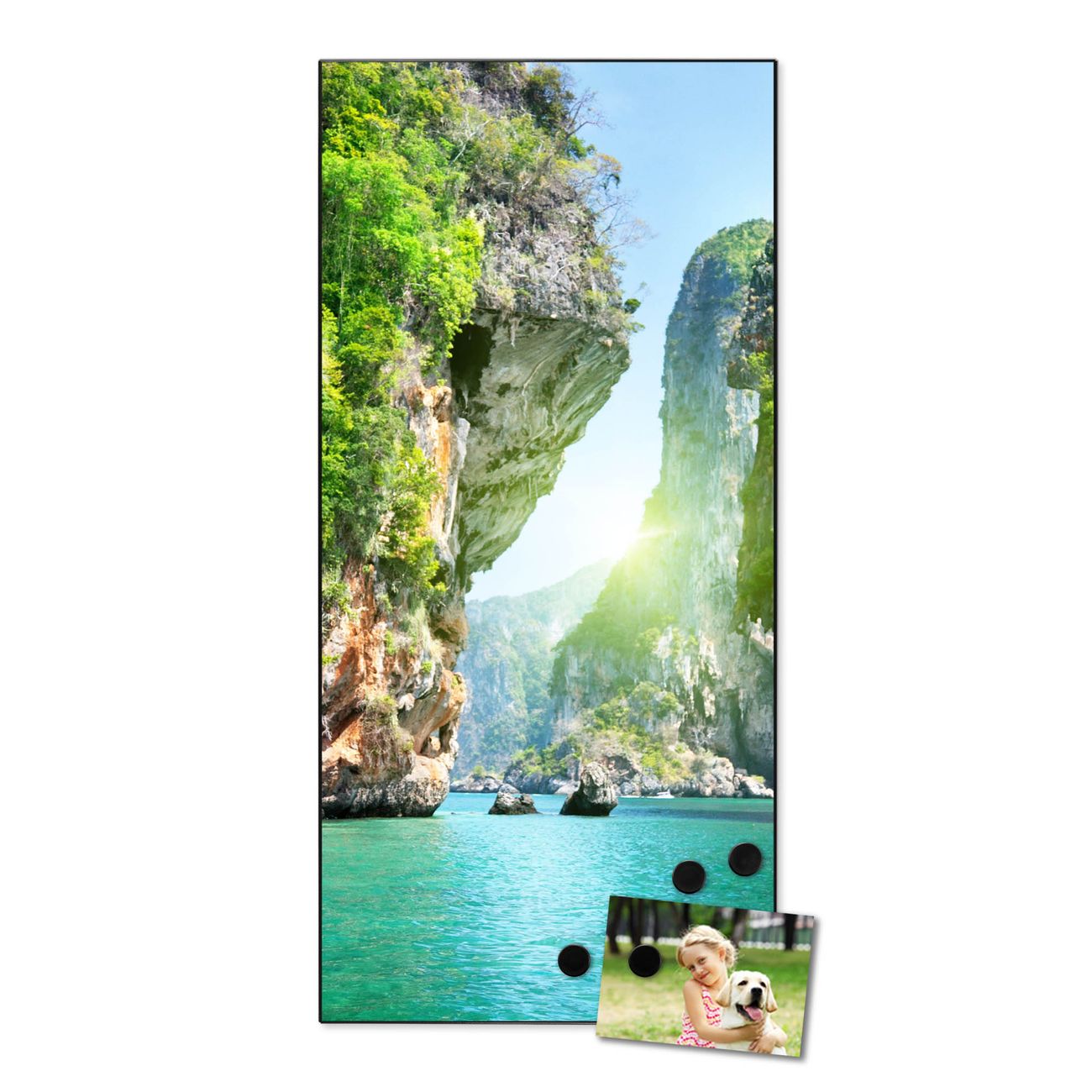FUNKTION:  Die banjado Magnettafel mit Motiv Versteckte Bucht Motiv bringt Ordnung in Ihr Zettelchaos. Fotos, Termine, Notizen oder Rezepte lassen Sich hier stilvoll mit Magneten ordnen, Sie behalten alles im Blick. An der Design Magnettafel halten alle handesüblichen Magnete. DESIGN:  Die magnetische Pinnwand mit dem Motiv Motiv Versteckte Bucht ist ein eleganter Begleiter im Alltag. Mit dieser Memotafel aus Metall haben Sie auch ohne Notizen und Magnete ein schönes Dekoelement. Das Format bietet Ihnen ausreichend Platz um alle wichtigen Informationen im Blick zu behalten. DETAILS:  Die Magnettafel besteht aus silber-grau, weiß oder schwarzlackiertem Stahl. Sie hat eine Größe von 37 x 78 x 2cm. Es befinden sich auf der Rückseite vorgefertigte Aufhängungen die eine schnelle und unkomplizierte Anbringung ermöglichen. Das Motiv ist mit einem seidenmatten Laminat versehen und schützt so zusätzlich vor Kratzern. NUTZEN:  Sie können dieses Memoboard groß als Wandbild nutzen, es halten alle handelsüblichen Magneten daran. Die Pinnwand ist mit einem feuchten Lappen oder Schwamm abwischbar. Sie finden bei uns eine große Auswahl an passenden Magneten. BANJADO:  Wir sind ein kleines Team aus dem Herzen von Sachsen. Wir fertigen alle Artikel von Hand für Sie an, Sie erhalten keine preiswerte Importware. Auf Wunsch können Sie auch Ihr eigenes Foto auf die Magnettafel aufbringen, schreiben Sie uns an. Herzlichst, Ihr banjado-Team