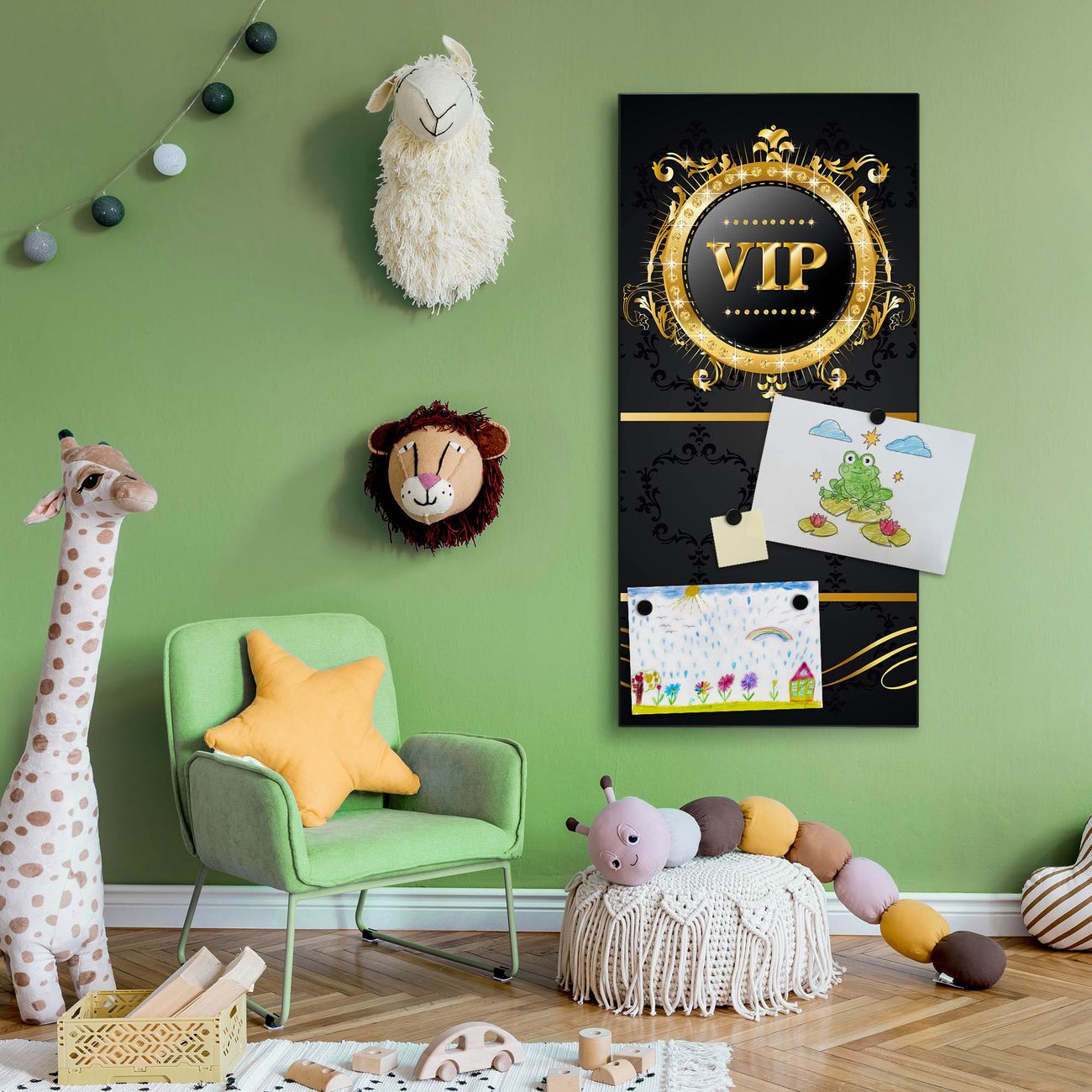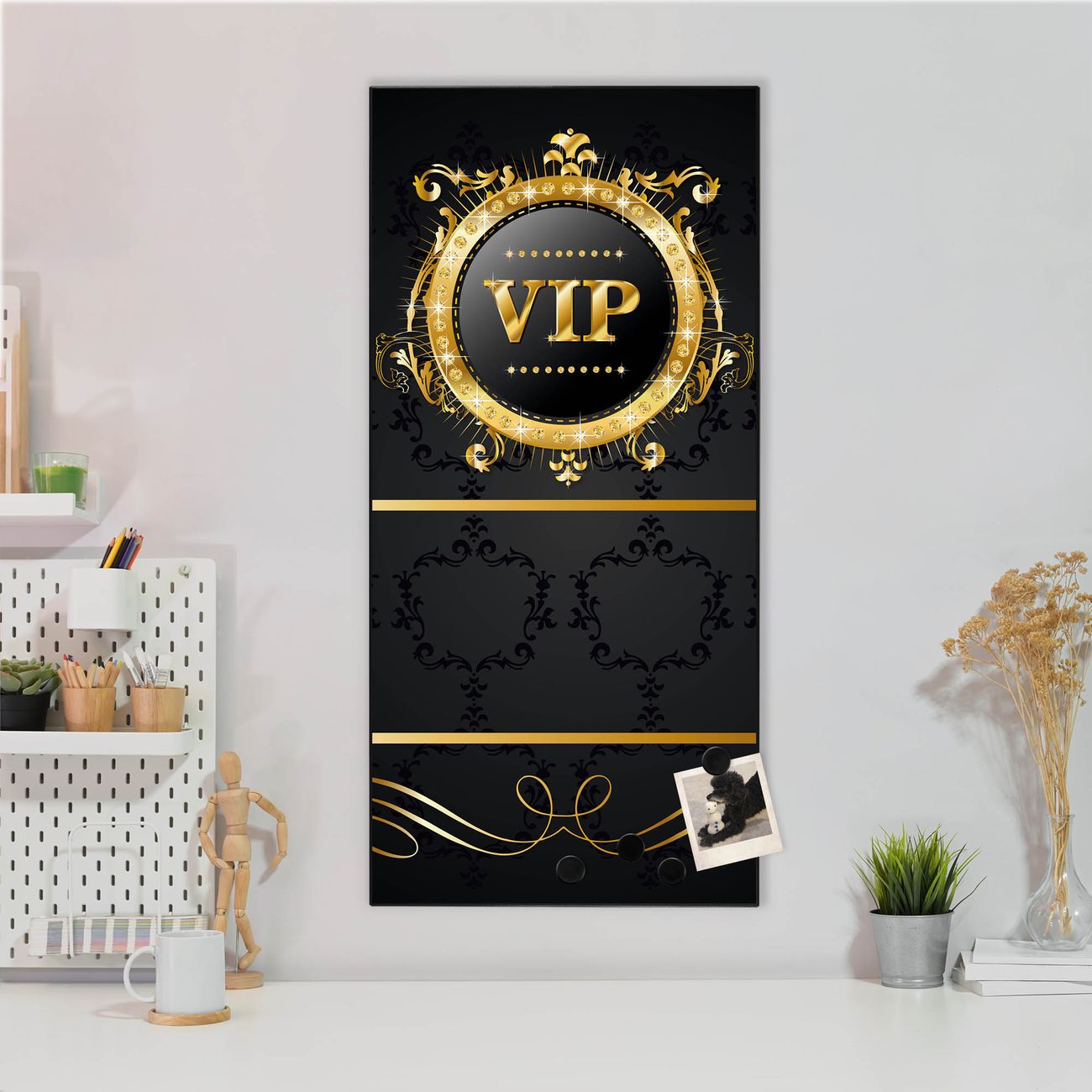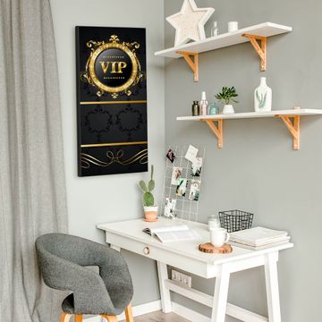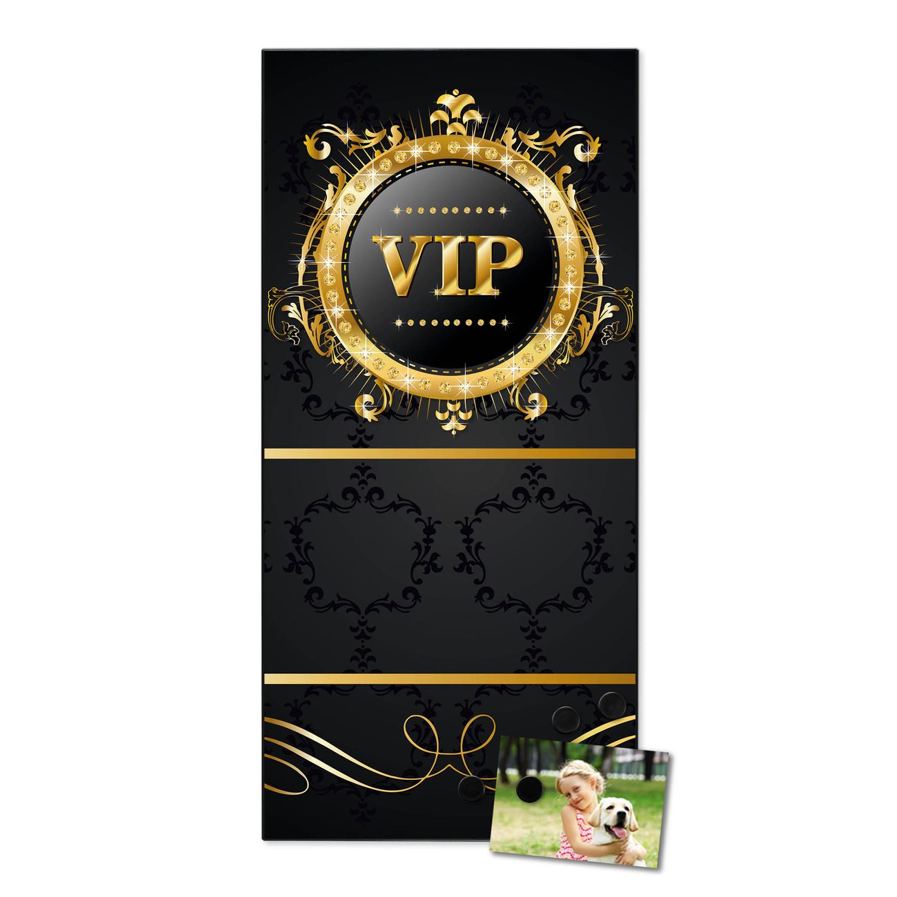 FUNKTION:  Die banjado Magnettafel mit Motiv VIP Motiv bringt Ordnung in Ihr Zettelchaos. Fotos, Termine, Notizen oder Rezepte lassen Sich hier stilvoll mit Magneten ordnen, Sie behalten alles im Blick. An der Design Magnettafel halten alle handesüblichen Magnete. DESIGN:  Die magnetische Pinnwand mit dem Motiv Motiv VIP ist ein eleganter Begleiter im Alltag. Mit dieser Memotafel aus Metall haben Sie auch ohne Notizen und Magnete ein schönes Dekoelement. Das Format bietet Ihnen ausreichend Platz um alle wichtigen Informationen im Blick zu behalten. DETAILS:  Die Magnettafel besteht aus silber-grau, weiß oder schwarzlackiertem Stahl. Sie hat eine Größe von 37 x 78 x 2cm. Es befinden sich auf der Rückseite vorgefertigte Aufhängungen die eine schnelle und unkomplizierte Anbringung ermöglichen. Das Motiv ist mit einem seidenmatten Laminat versehen und schützt so zusätzlich vor Kratzern. NUTZEN:  Sie können dieses Memoboard groß als Wandbild nutzen, es halten alle handelsüblichen Magneten daran. Die Pinnwand ist mit einem feuchten Lappen oder Schwamm abwischbar. Sie finden bei uns eine große Auswahl an passenden Magneten. BANJADO:  Wir sind ein kleines Team aus dem Herzen von Sachsen. Wir fertigen alle Artikel von Hand für Sie an, Sie erhalten keine preiswerte Importware. Auf Wunsch können Sie auch Ihr eigenes Foto auf die Magnettafel aufbringen, schreiben Sie uns an. Herzlichst, Ihr banjado-Team