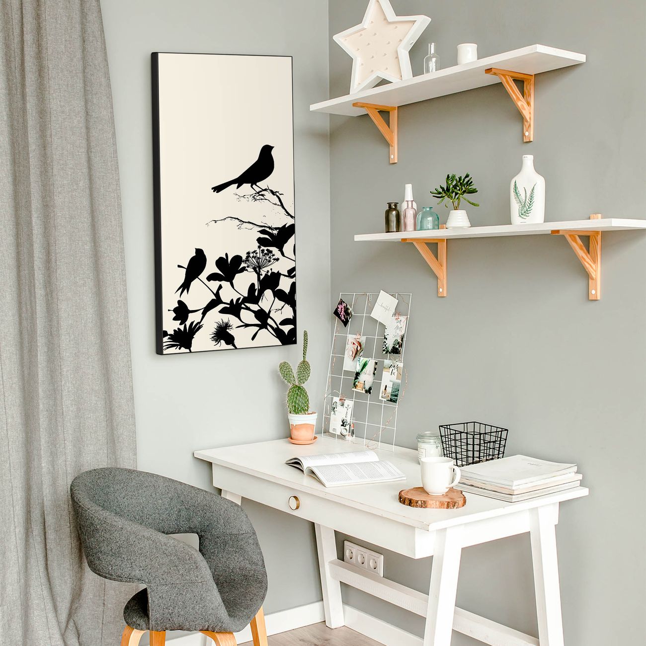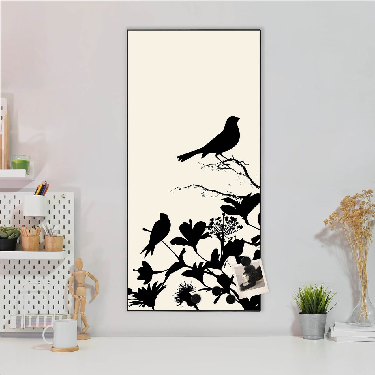 FUNKTION:  Die banjado Magnettafel mit Motiv Vögel Schattenriß Motiv bringt Ordnung in Ihr Zettelchaos. Fotos, Termine, Notizen oder Rezepte lassen Sich hier stilvoll mit Magneten ordnen, Sie behalten alles im Blick. An der Design Magnettafel halten alle handesüblichen Magnete. DESIGN:  Die magnetische Pinnwand mit dem Motiv Motiv Vögel Schattenriß ist ein eleganter Begleiter im Alltag. Mit dieser Memotafel aus Metall haben Sie auch ohne Notizen und Magnete ein schönes Dekoelement. Das Format bietet Ihnen ausreichend Platz um alle wichtigen Informationen im Blick zu behalten. DETAILS:  Die Magnettafel besteht aus silber-grau, weiß oder schwarzlackiertem Stahl. Sie hat eine Größe von 37 x 78 x 2cm. Es befinden sich auf der Rückseite vorgefertigte Aufhängungen die eine schnelle und unkomplizierte Anbringung ermöglichen. Das Motiv ist mit einem seidenmatten Laminat versehen und schützt so zusätzlich vor Kratzern. NUTZEN:  Sie können dieses Memoboard groß als Wandbild nutzen, es halten alle handelsüblichen Magneten daran. Die Pinnwand ist mit einem feuchten Lappen oder Schwamm abwischbar. Sie finden bei uns eine große Auswahl an passenden Magneten. BANJADO:  Wir sind ein kleines Team aus dem Herzen von Sachsen. Wir fertigen alle Artikel von Hand für Sie an, Sie erhalten keine preiswerte Importware. Auf Wunsch können Sie auch Ihr eigenes Foto auf die Magnettafel aufbringen, schreiben Sie uns an. Herzlichst, Ihr banjado-Team