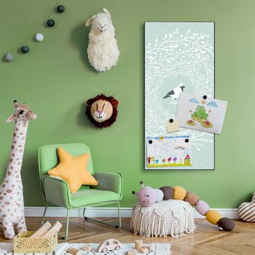 FUNKTION:  Die banjado Magnettafel mit Motiv Vogel im Kranz Motiv bringt Ordnung in Ihr Zettelchaos. Fotos, Termine, Notizen oder Rezepte lassen Sich hier stilvoll mit Magneten ordnen, Sie behalten alles im Blick. An der Design Magnettafel halten alle handesüblichen Magnete. DESIGN:  Die magnetische Pinnwand mit dem Motiv Motiv Vogel im Kranz ist ein eleganter Begleiter im Alltag. Mit dieser Memotafel aus Metall haben Sie auch ohne Notizen und Magnete ein schönes Dekoelement. Das Format bietet Ihnen ausreichend Platz um alle wichtigen Informationen im Blick zu behalten. DETAILS:  Die Magnettafel besteht aus silber-grau, weiß oder schwarzlackiertem Stahl. Sie hat eine Größe von 37 x 78 x 2cm. Es befinden sich auf der Rückseite vorgefertigte Aufhängungen die eine schnelle und unkomplizierte Anbringung ermöglichen. Das Motiv ist mit einem seidenmatten Laminat versehen und schützt so zusätzlich vor Kratzern. NUTZEN:  Sie können dieses Memoboard groß als Wandbild nutzen, es halten alle handelsüblichen Magneten daran. Die Pinnwand ist mit einem feuchten Lappen oder Schwamm abwischbar. Sie finden bei uns eine große Auswahl an passenden Magneten. BANJADO:  Wir sind ein kleines Team aus dem Herzen von Sachsen. Wir fertigen alle Artikel von Hand für Sie an, Sie erhalten keine preiswerte Importware. Auf Wunsch können Sie auch Ihr eigenes Foto auf die Magnettafel aufbringen, schreiben Sie uns an. Herzlichst, Ihr banjado-Team