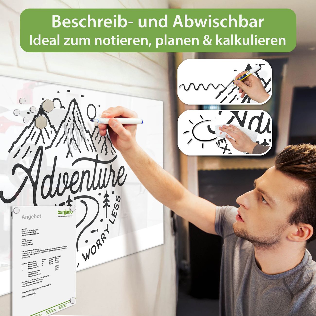 Jede Glas Magnettafel wird in unserer Werkstatt von Hand gefertigt und sorgfältig geprüft. So erhalten Sie ein echtes Qualitätsprodukt, das Funktion und Ästhetik perfekt vereint.?? Warum banjado?