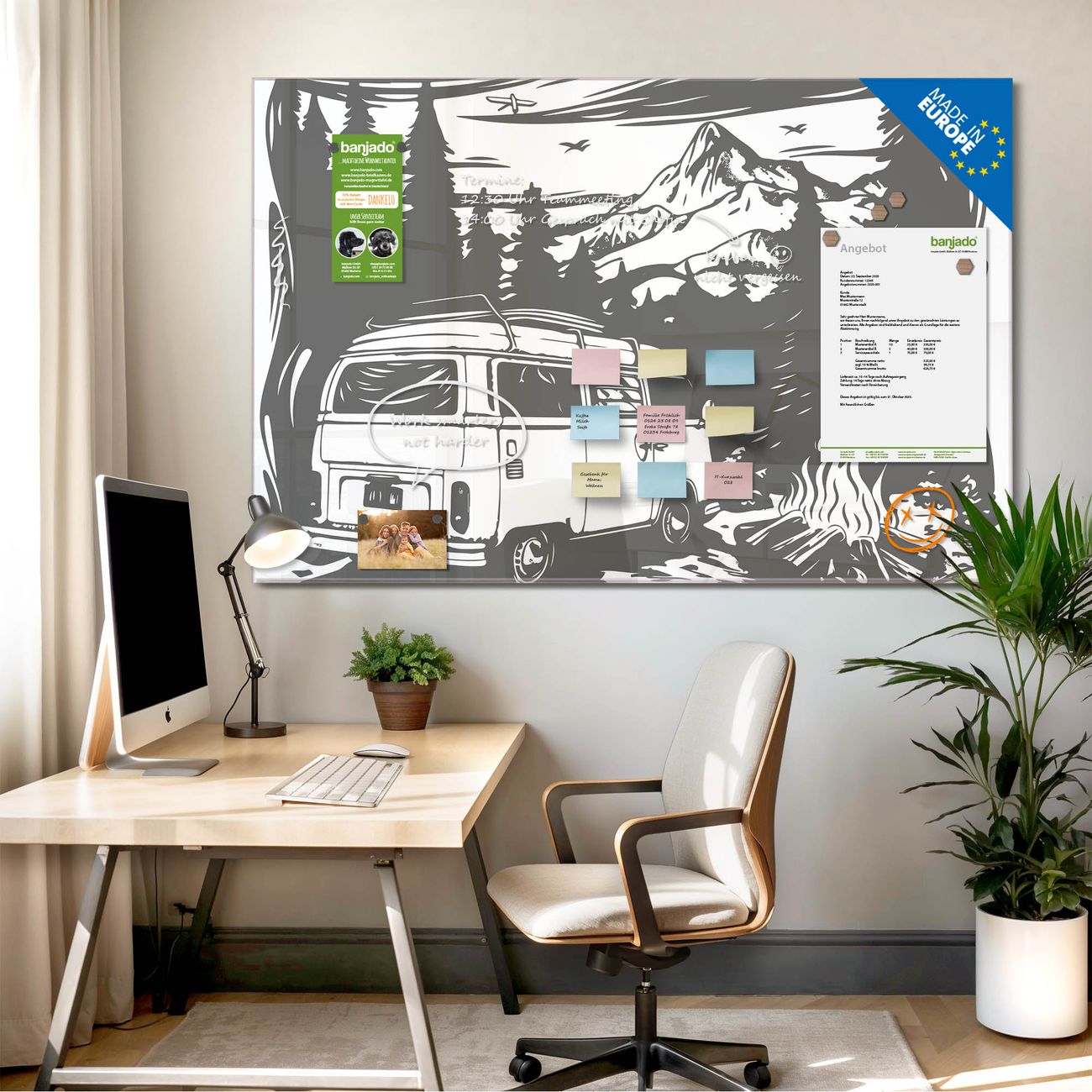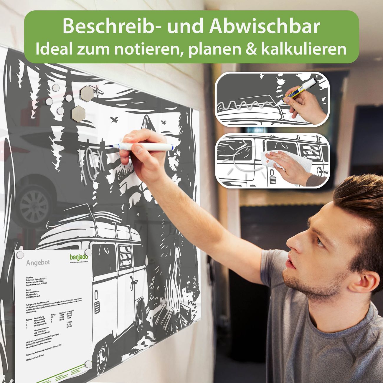 Die banjado Glas Magnettafel mit dem Motiv Motiv Abenteuerliche Campingszene verbindet Funktionalität mit Stil. Sie ersetzt das Zettelchaos durch klare Strukturen und bringt dabei eine warme, natürliche Atmosphäre in Ihr Zuhause. Ob im Büro, in der Küche oder im Eingangsbereich - dieses Design-Board zieht Blicke an und sorgt für Ordnung mit Charakter.
