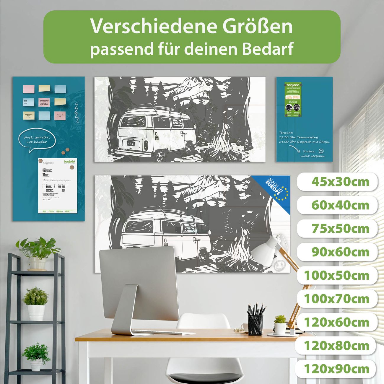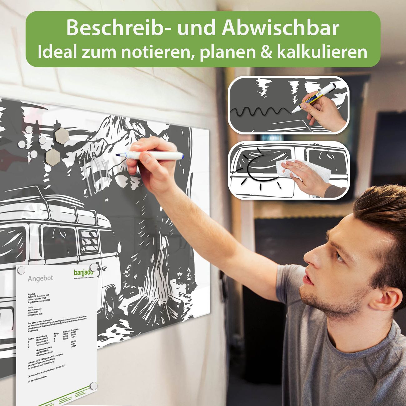 Jede Glas Magnettafel wird in unserer Werkstatt von Hand gefertigt und sorgfältig geprüft. So erhalten Sie ein echtes Qualitätsprodukt, das Funktion und Ästhetik perfekt vereint.?? Warum banjado?