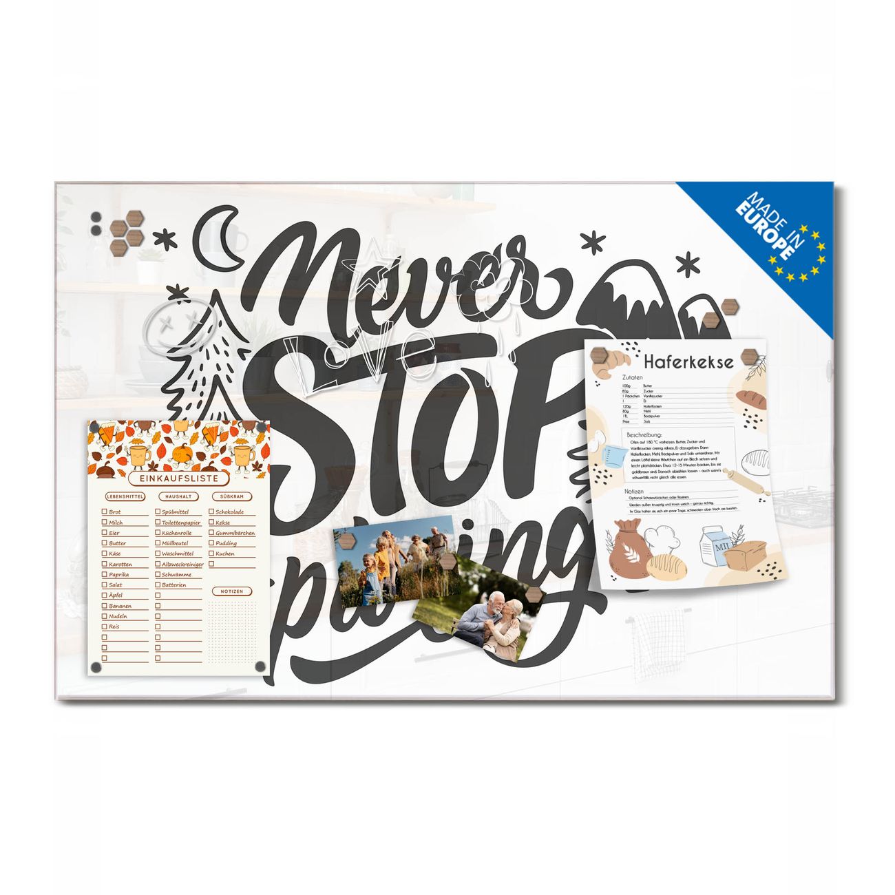 Ein Stück Design, das Ihren Alltag organisiert. Schreiben, heften, inspirieren - alles an einem Ort. Qualität, die man spürt. Montage leicht gemacht. Handwerk mit Herz - veredelt in Sachsen. Einzigartiges Design mit Motiv Motiv Abenteuerlust Beschreibbare Glasoberfläche, leicht zu reinigen Starke Magnetkraft durch Stahlrückwand Inklusive 4 Neodym-Magneten Flexible Montageoptionen Handveredelt in Sachsen - Qualität, die bleibt