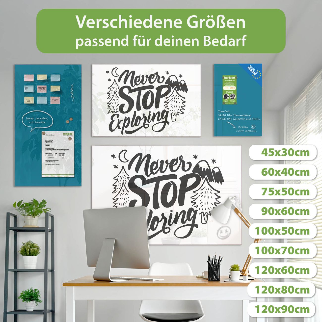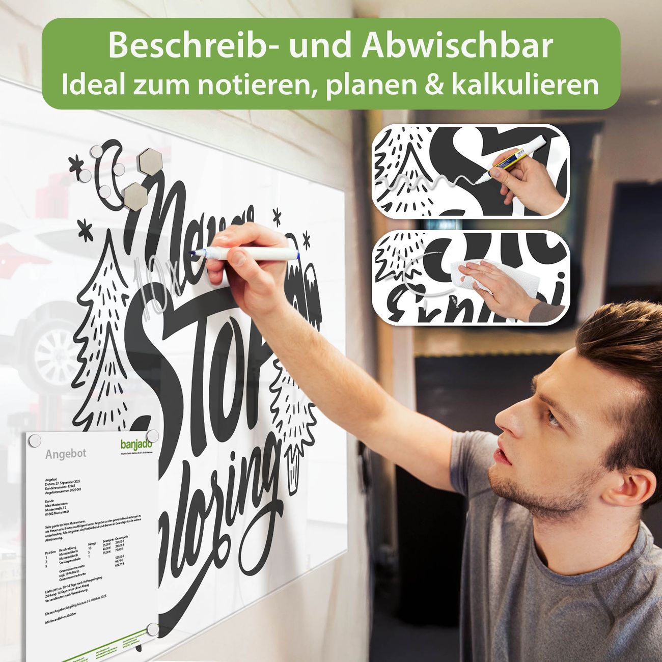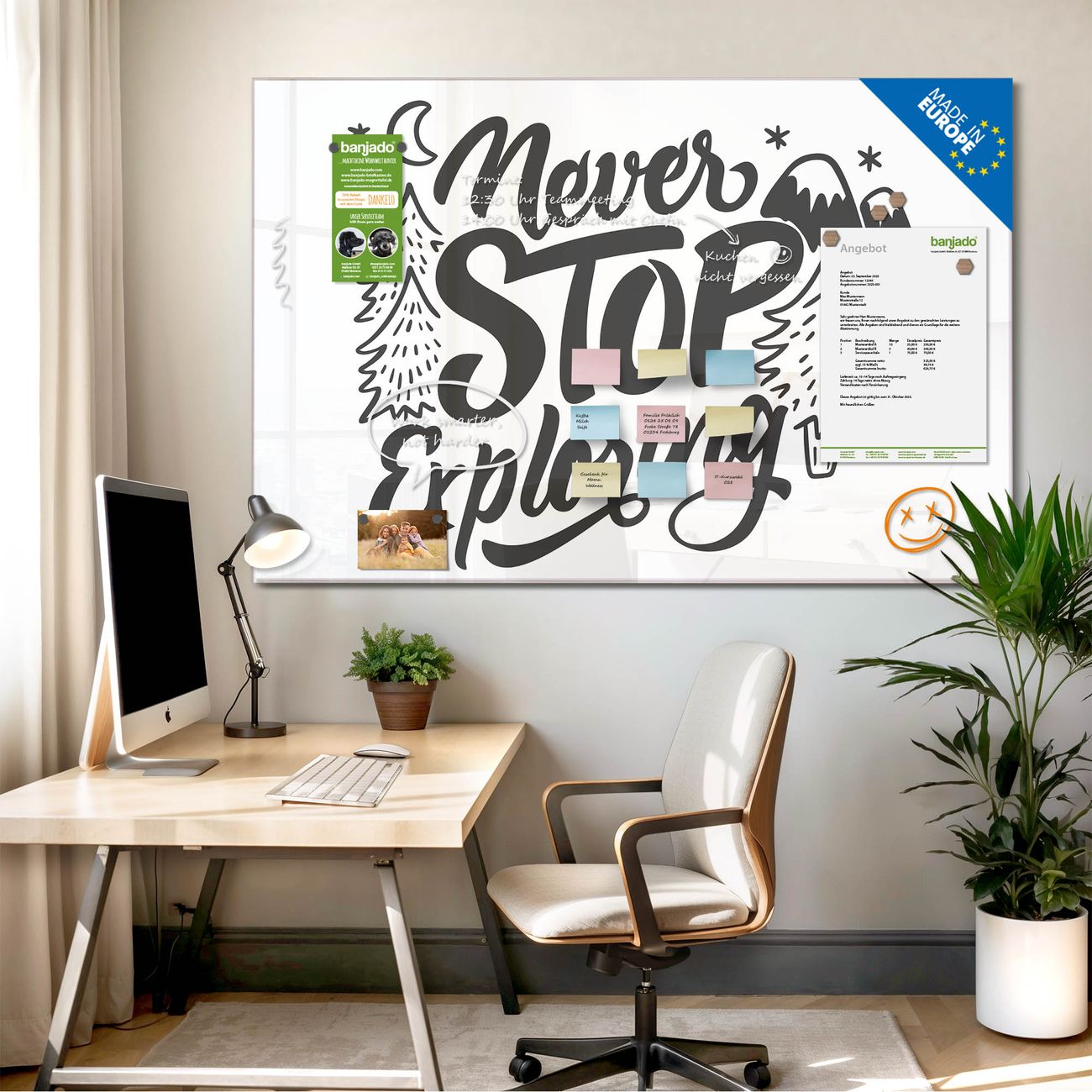 Jede Glas Magnettafel wird in unserer Werkstatt von Hand gefertigt und sorgfältig geprüft. So erhalten Sie ein echtes Qualitätsprodukt, das Funktion und Ästhetik perfekt vereint.?? Warum banjado?
