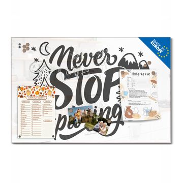 Auf der glatten Glasoberfläche lassen sich Termine, Rezepte oder Notizen ganz einfach mit Kreidestiften festhalten und rückstandslos entfernen. Starke Neodym-Magnete halten Ihre wichtigsten Erinnerungen sicher an Ort und Stelle. So entsteht Ihre ganz persönliche Ideenwand - jeden Tag neu.