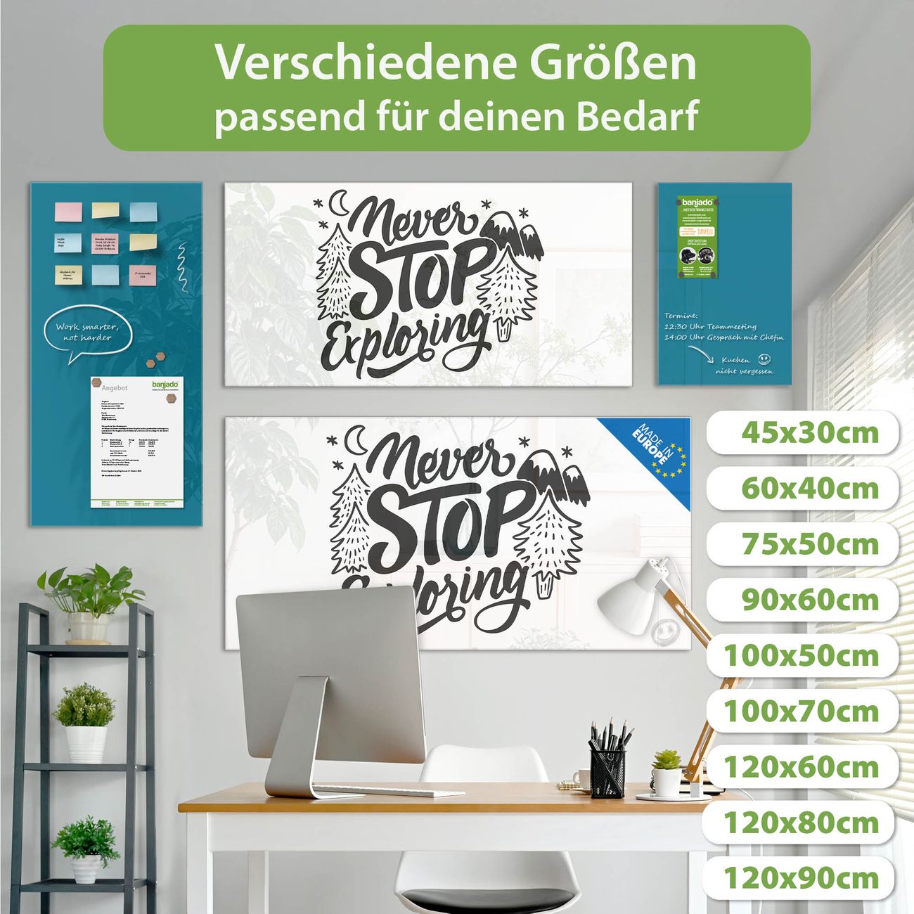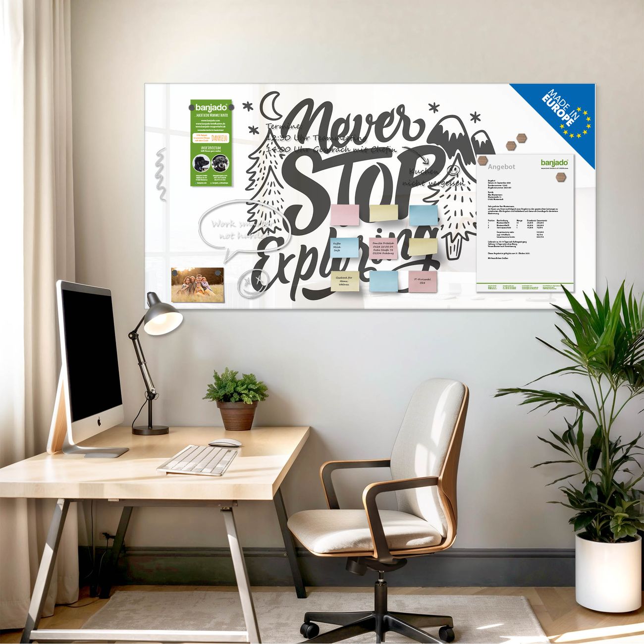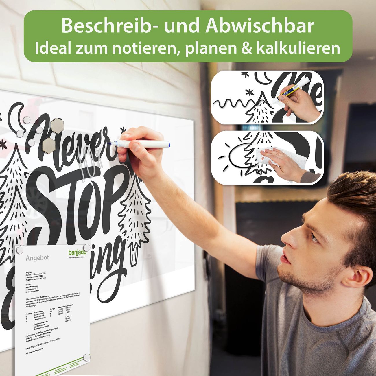 Jede Glas Magnettafel wird in unserer Werkstatt von Hand gefertigt und sorgfältig geprüft. So erhalten Sie ein echtes Qualitätsprodukt, das Funktion und Ästhetik perfekt vereint.?? Warum banjado?
