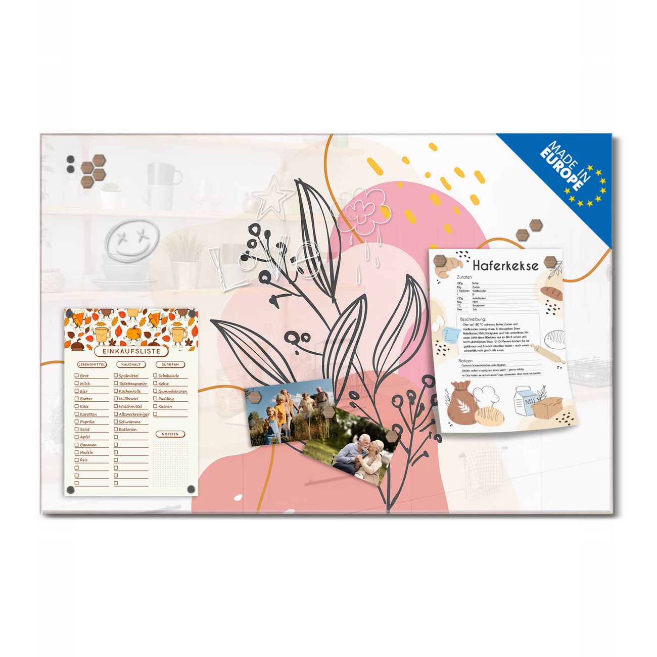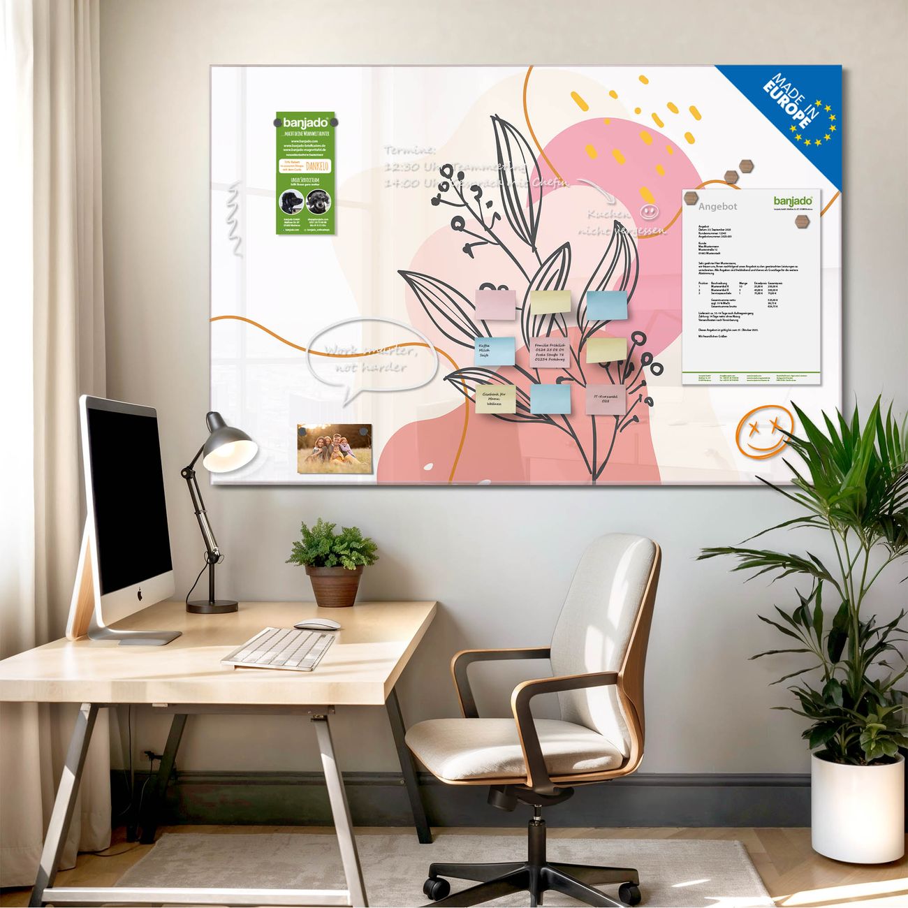 Die banjado Glas Magnettafel mit dem Motiv Motiv Abstrakte Blumenkomposition verbindet Funktionalität mit Stil. Sie ersetzt das Zettelchaos durch klare Strukturen und bringt dabei eine warme, natürliche Atmosphäre in Ihr Zuhause. Ob im Büro, in der Küche oder im Eingangsbereich - dieses Design-Board zieht Blicke an und sorgt für Ordnung mit Charakter.