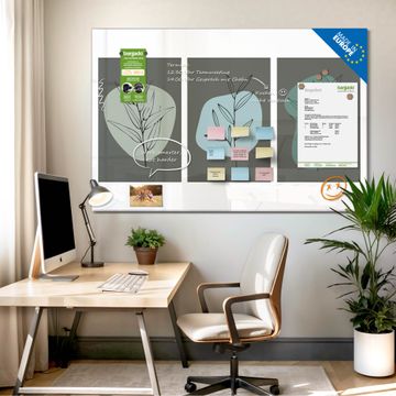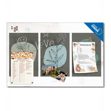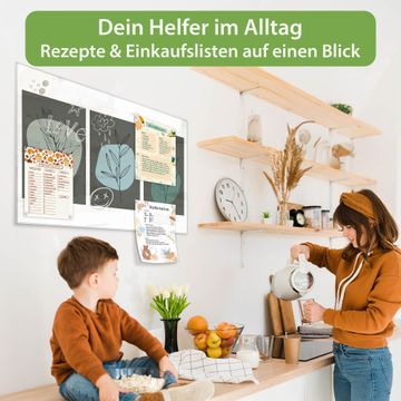 Auf der glatten Glasoberfläche lassen sich Termine, Rezepte oder Notizen ganz einfach mit Kreidestiften festhalten und rückstandslos entfernen. Starke Neodym-Magnete halten Ihre wichtigsten Erinnerungen sicher an Ort und Stelle. So entsteht Ihre ganz persönliche Ideenwand - jeden Tag neu.