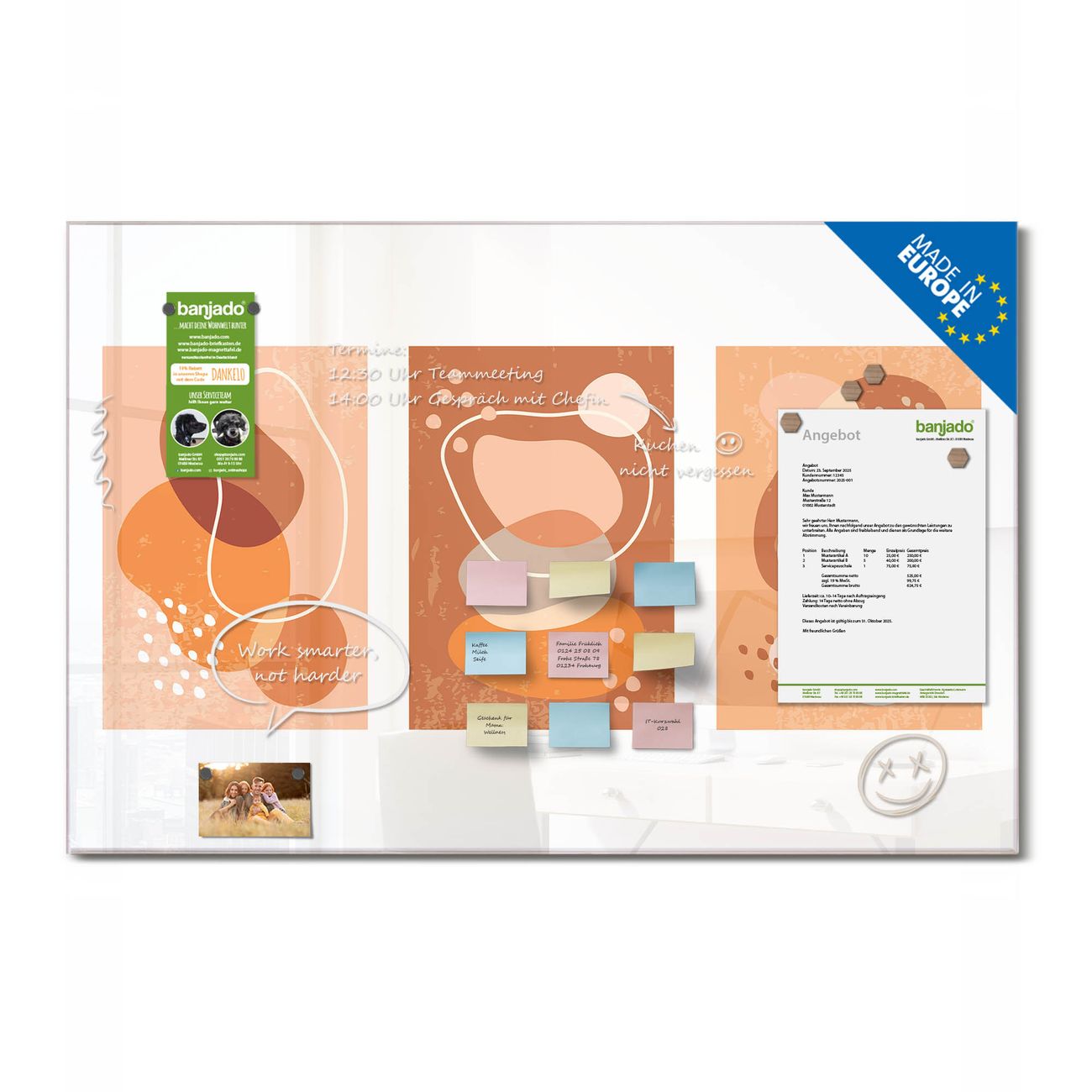 Jede Glas Magnettafel wird in unserer Werkstatt von Hand gefertigt und sorgfältig geprüft. So erhalten Sie ein echtes Qualitätsprodukt, das Funktion und Ästhetik perfekt vereint.?? Warum banjado?