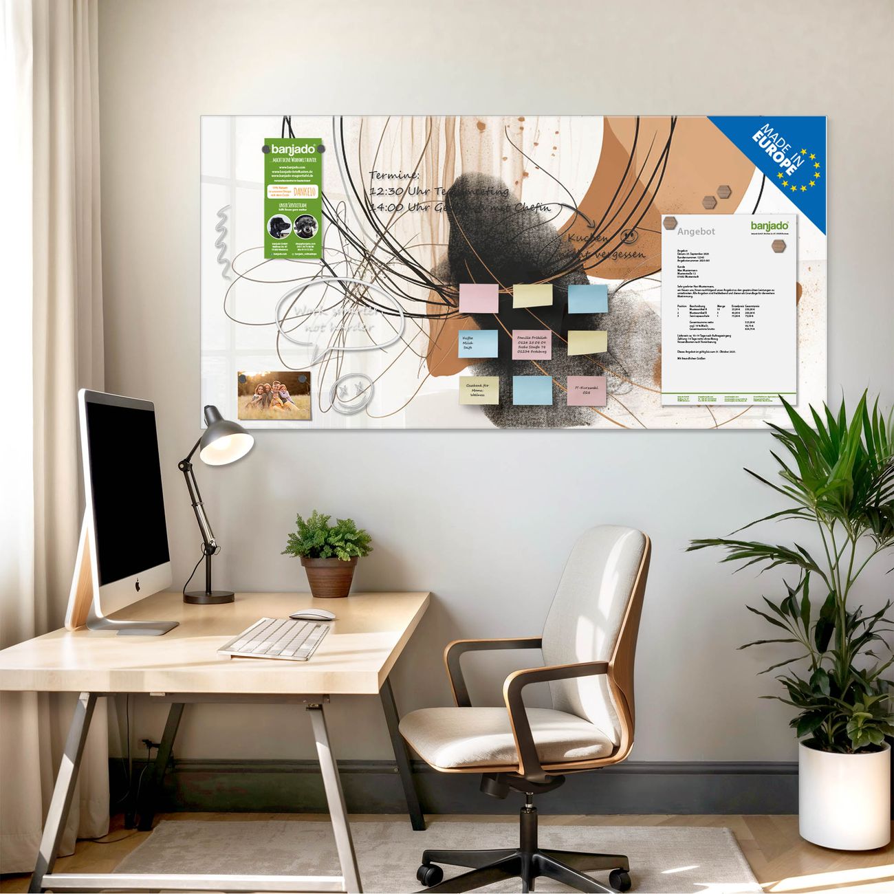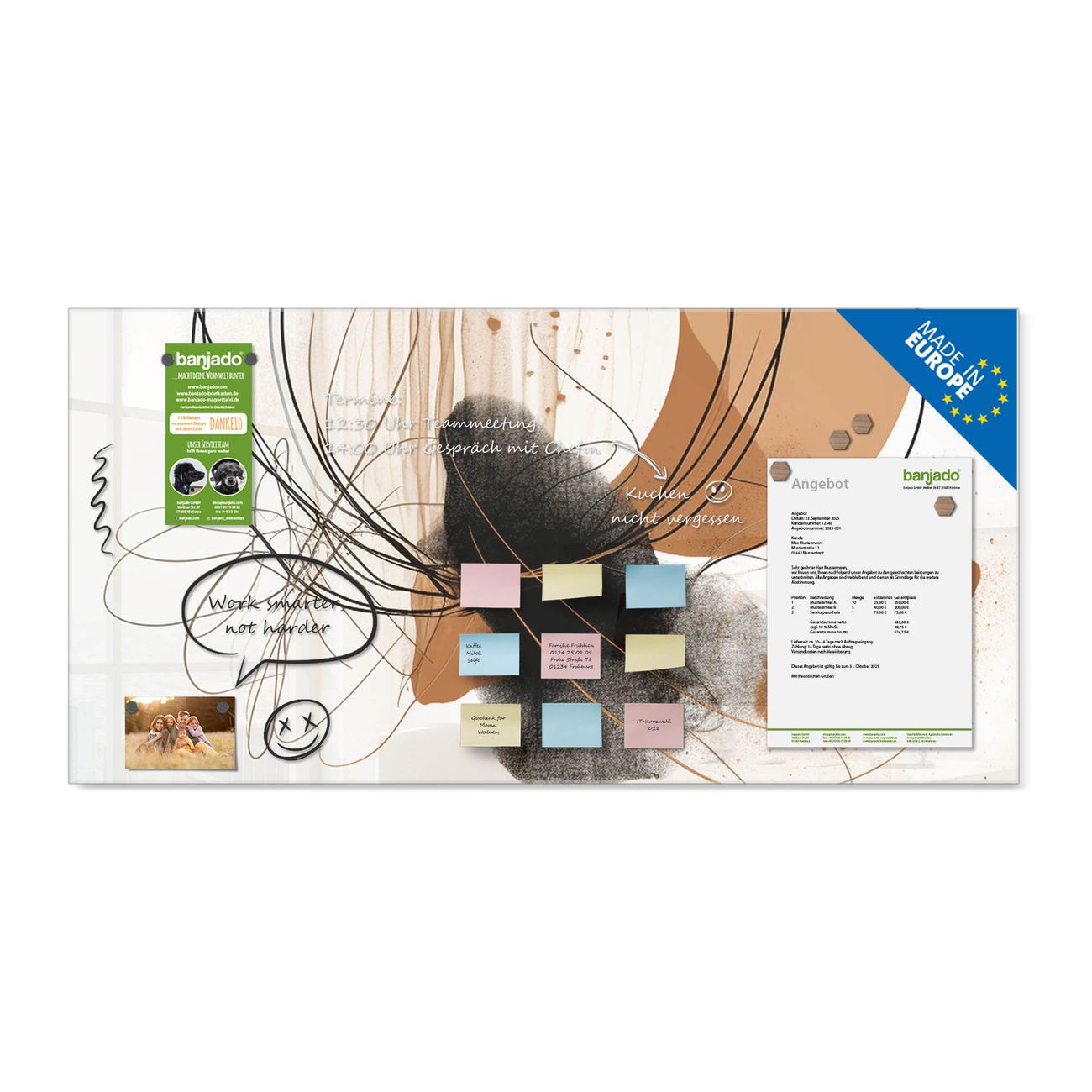 Die banjado Glas Magnettafel mit dem Motiv Motiv Abstrakte Kreisformen verbindet Funktionalität mit Stil. Sie ersetzt das Zettelchaos durch klare Strukturen und bringt dabei eine warme, natürliche Atmosphäre in Ihr Zuhause. Ob im Büro, in der Küche oder im Eingangsbereich - dieses Design-Board zieht Blicke an und sorgt für Ordnung mit Charakter.