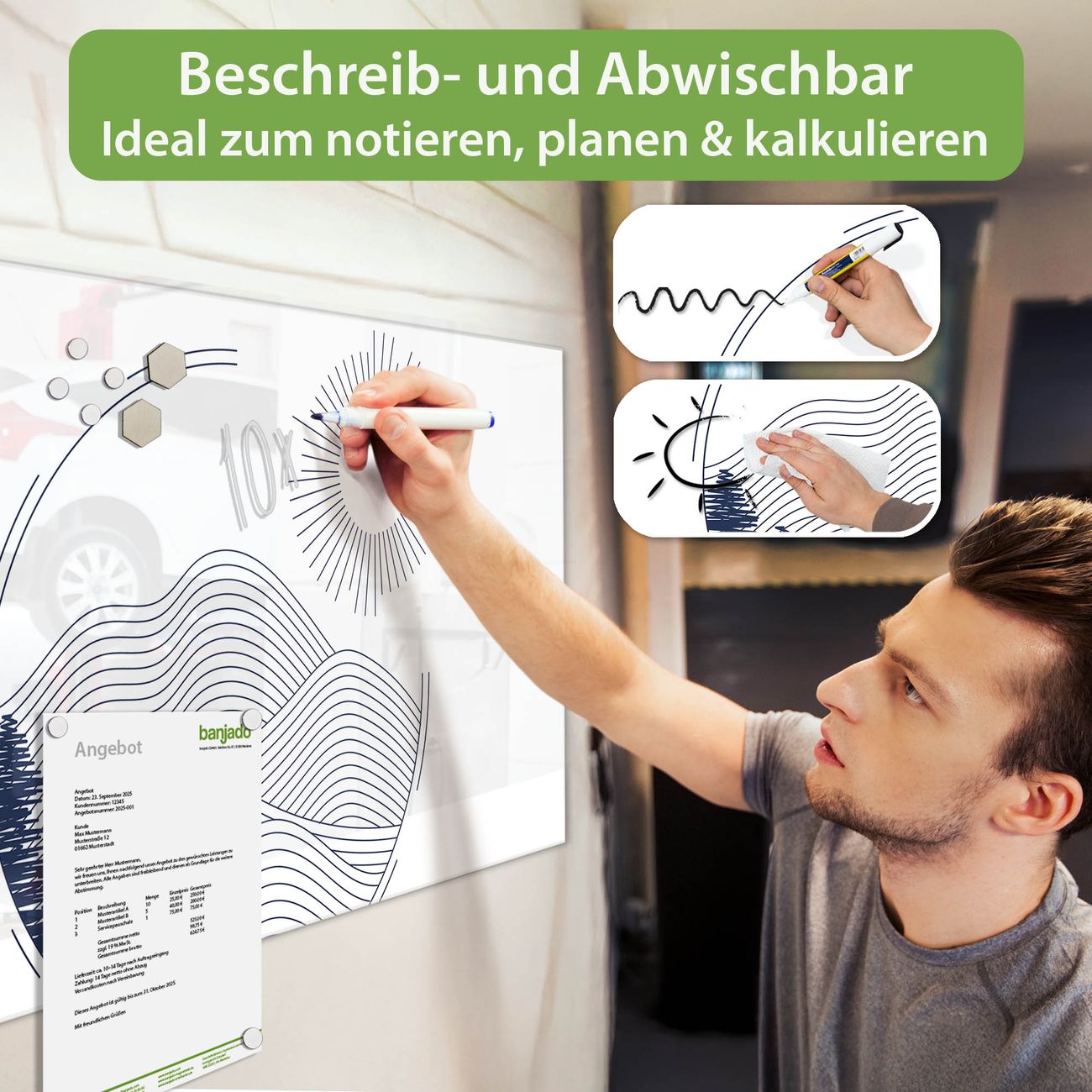 Jede Glas Magnettafel wird in unserer Werkstatt von Hand gefertigt und sorgfältig geprüft. So erhalten Sie ein echtes Qualitätsprodukt, das Funktion und Ästhetik perfekt vereint.?? Warum banjado?