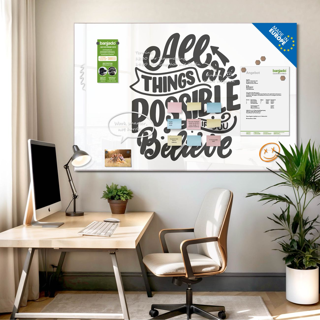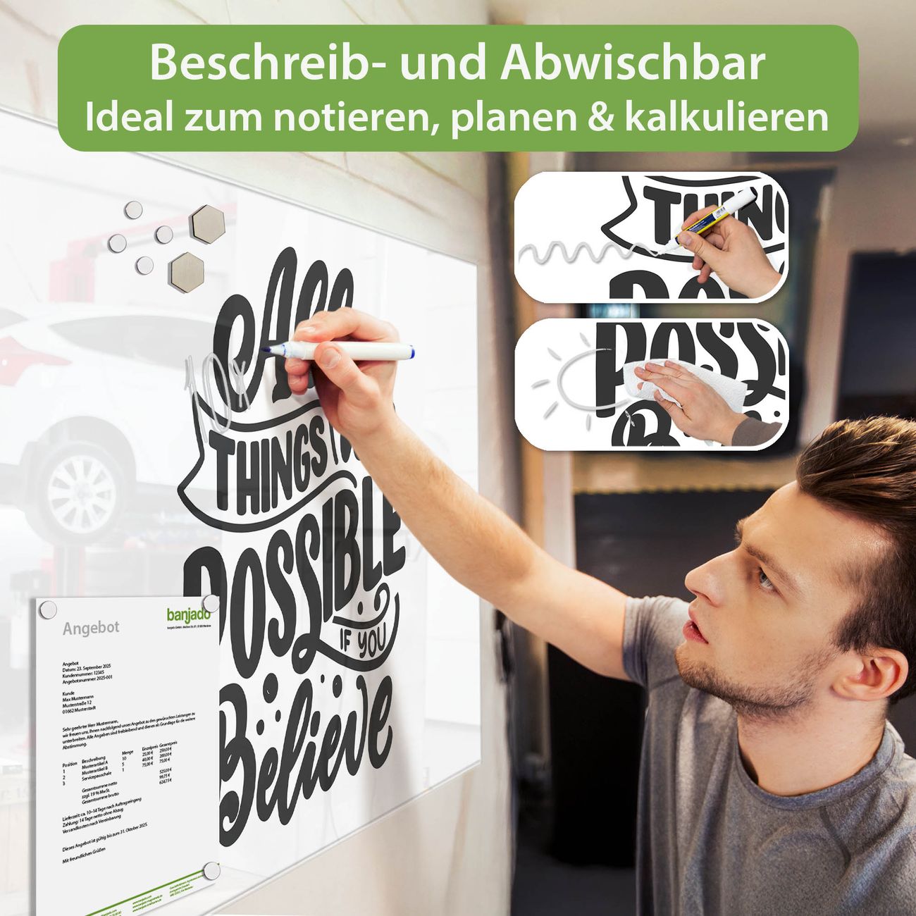 Jede Glas Magnettafel wird in unserer Werkstatt von Hand gefertigt und sorgfältig geprüft. So erhalten Sie ein echtes Qualitätsprodukt, das Funktion und Ästhetik perfekt vereint.?? Warum banjado?