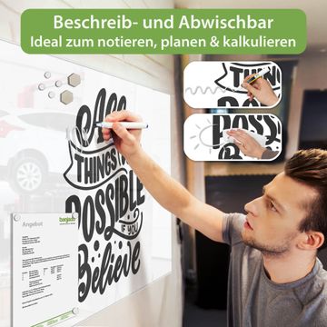 Auf der glatten Glasoberfläche lassen sich Termine, Rezepte oder Notizen ganz einfach mit Kreidestiften festhalten und rückstandslos entfernen. Starke Neodym-Magnete halten Ihre wichtigsten Erinnerungen sicher an Ort und Stelle. So entsteht Ihre ganz persönliche Ideenwand - jeden Tag neu.