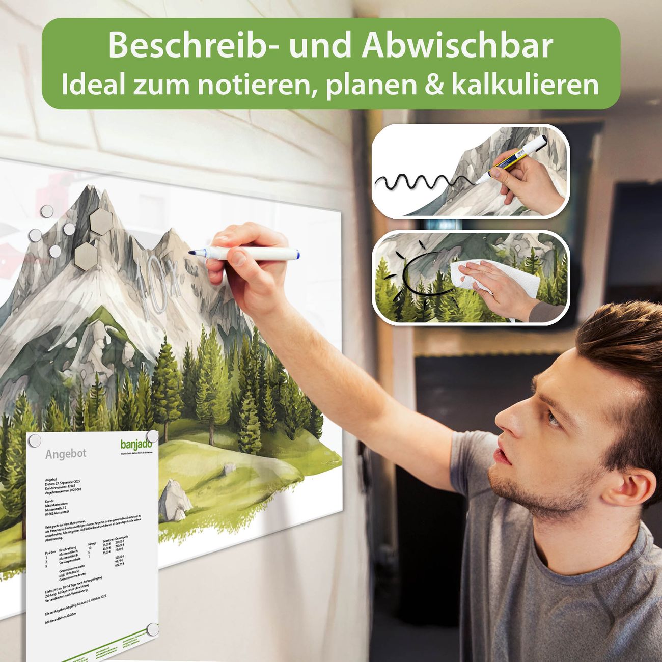 Die banjado Glas Magnettafel mit dem Motiv Motiv Alpine Landschaft verbindet Funktionalität mit Stil. Sie ersetzt das Zettelchaos durch klare Strukturen und bringt dabei eine warme, natürliche Atmosphäre in Ihr Zuhause. Ob im Büro, in der Küche oder im Eingangsbereich - dieses Design-Board zieht Blicke an und sorgt für Ordnung mit Charakter.