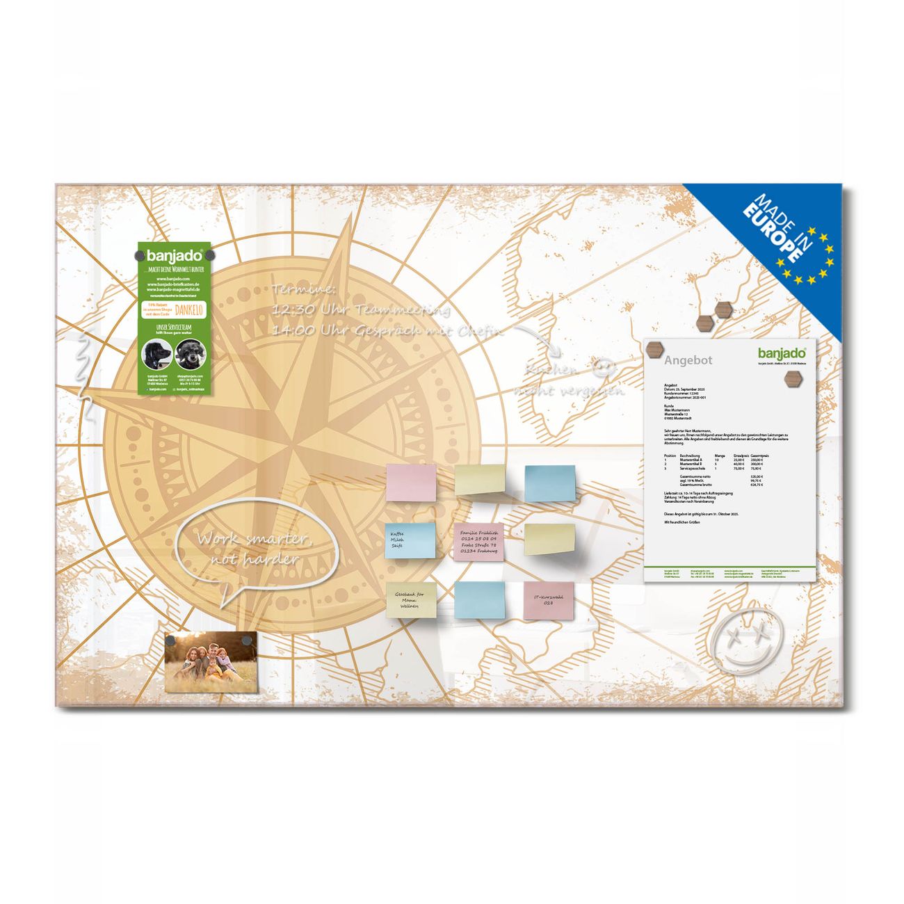 Jede Glas Magnettafel wird in unserer Werkstatt von Hand gefertigt und sorgfältig geprüft. So erhalten Sie ein echtes Qualitätsprodukt, das Funktion und Ästhetik perfekt vereint.?? Warum banjado?
