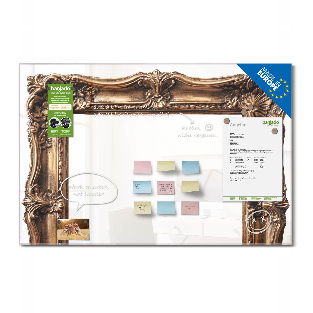 Jede Glas Magnettafel wird in unserer Werkstatt von Hand gefertigt und sorgfältig geprüft. So erhalten Sie ein echtes Qualitätsprodukt, das Funktion und Ästhetik perfekt vereint.?? Warum banjado?