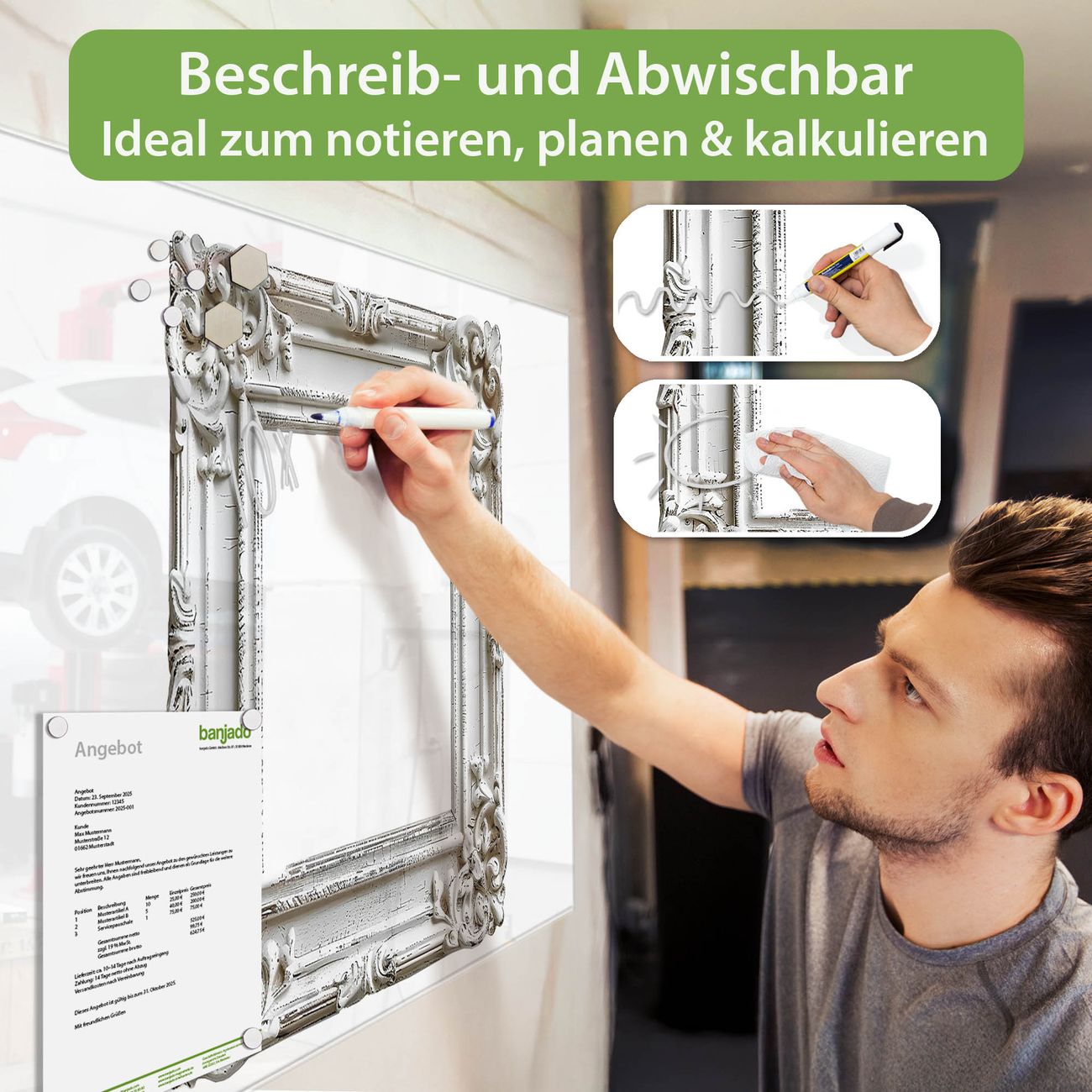 Jede Glas Magnettafel wird in unserer Werkstatt von Hand gefertigt und sorgfältig geprüft. So erhalten Sie ein echtes Qualitätsprodukt, das Funktion und Ästhetik perfekt vereint.?? Warum banjado?