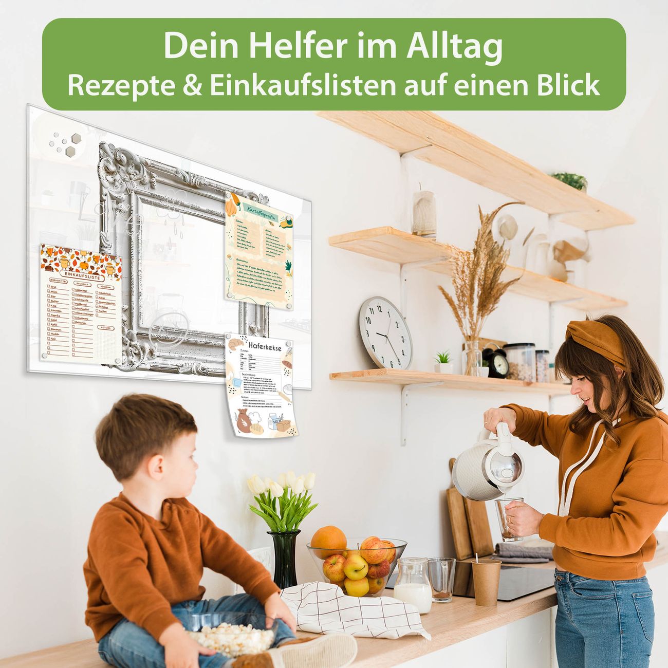 Ein Stück Design, das Ihren Alltag organisiert. Schreiben, heften, inspirieren - alles an einem Ort. Qualität, die man spürt. Montage leicht gemacht. Handwerk mit Herz - veredelt in Sachsen. Einzigartiges Design mit Motiv Motiv Antiker Bilderrahmen Beschreibbare Glasoberfläche, leicht zu reinigen Starke Magnetkraft durch Stahlrückwand Inklusive 4 Neodym-Magneten Flexible Montageoptionen Handveredelt in Sachsen - Qualität, die bleibt
