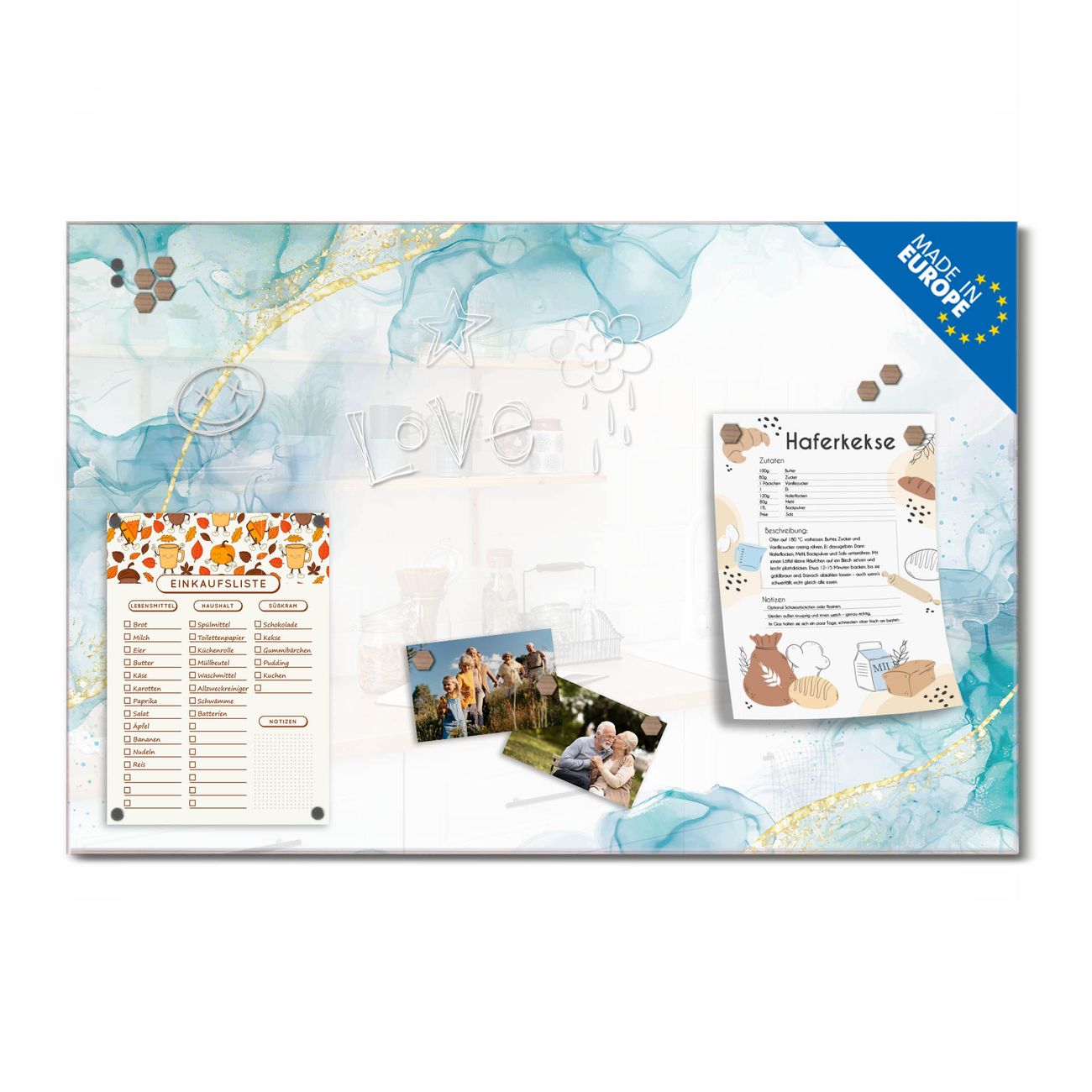 Ein Stück Design, das Ihren Alltag organisiert. Schreiben, heften, inspirieren - alles an einem Ort. Qualität, die man spürt. Montage leicht gemacht. Handwerk mit Herz - veredelt in Sachsen. Einzigartiges Design mit Motiv Motiv Aquarellfluss Beschreibbare Glasoberfläche, leicht zu reinigen Starke Magnetkraft durch Stahlrückwand Inklusive 4 Neodym-Magneten Flexible Montageoptionen Handveredelt in Sachsen - Qualität, die bleibt