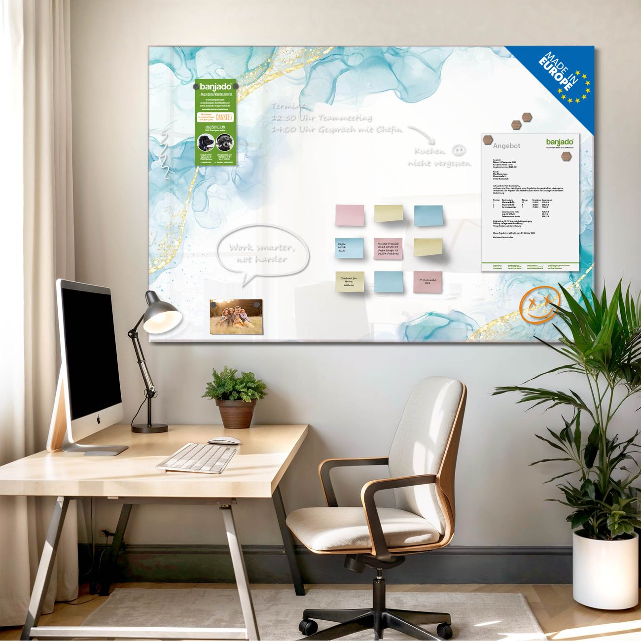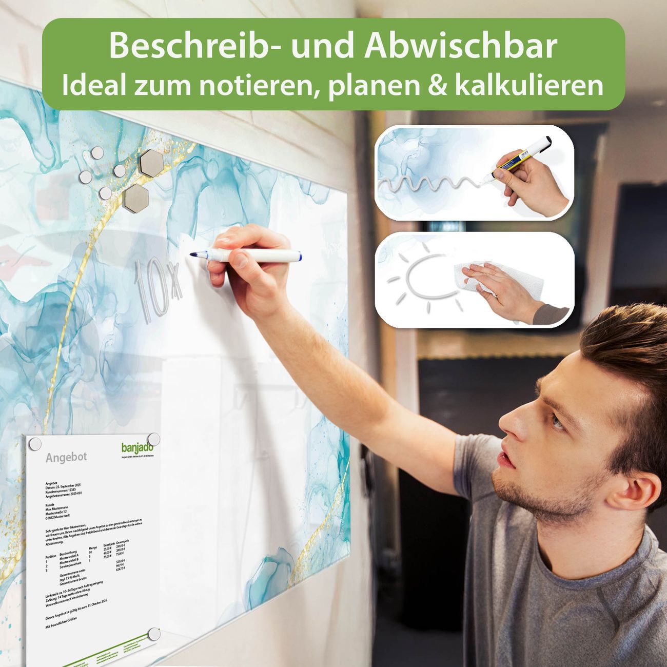 Jede Glas Magnettafel wird in unserer Werkstatt von Hand gefertigt und sorgfältig geprüft. So erhalten Sie ein echtes Qualitätsprodukt, das Funktion und Ästhetik perfekt vereint.?? Warum banjado?