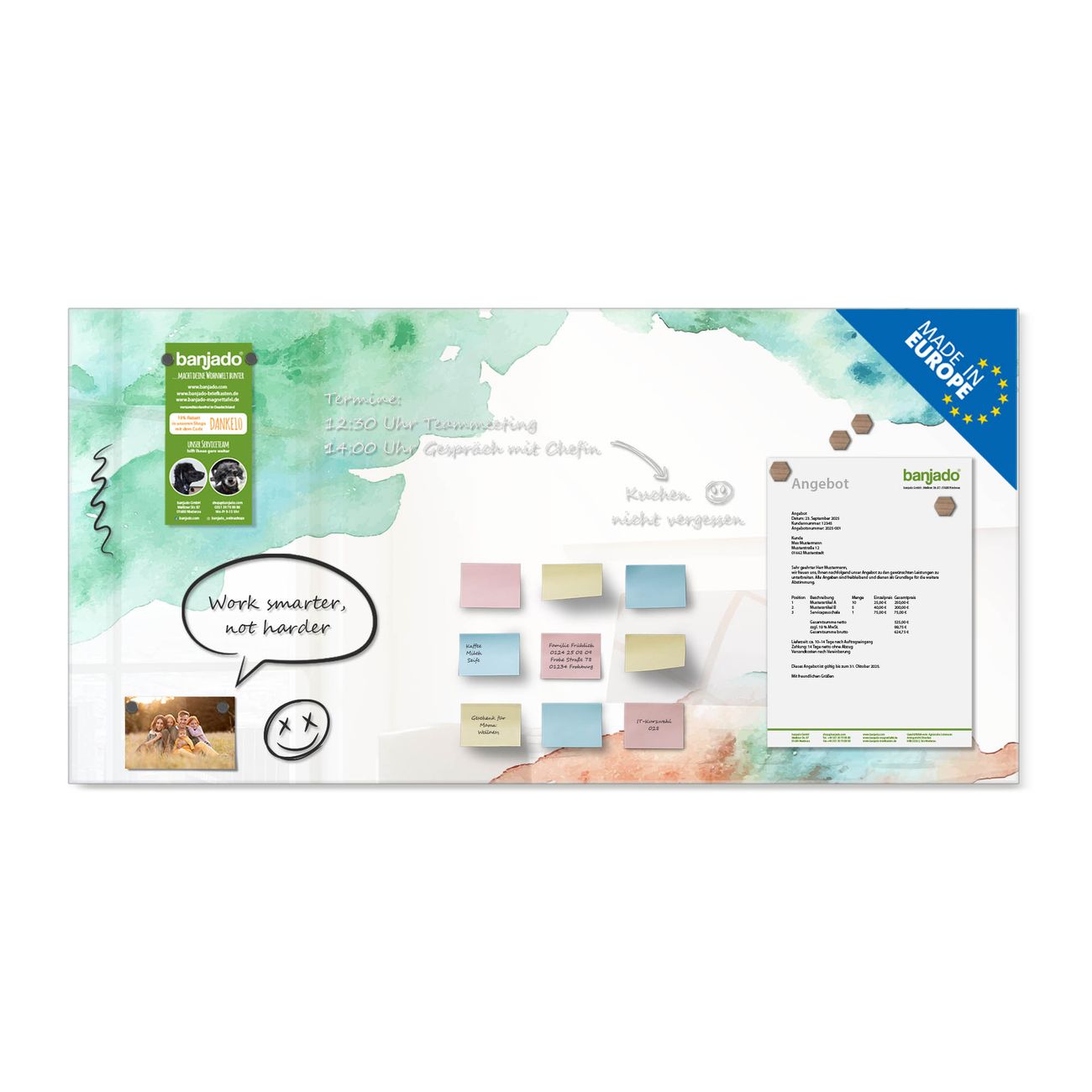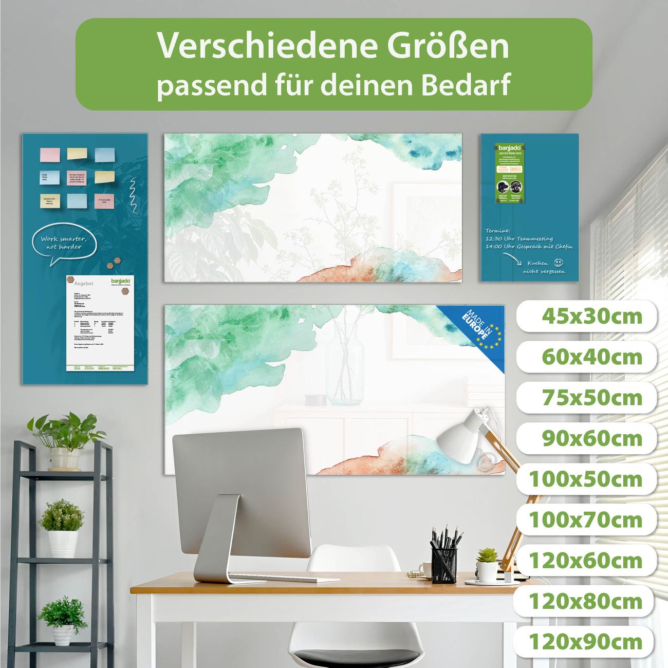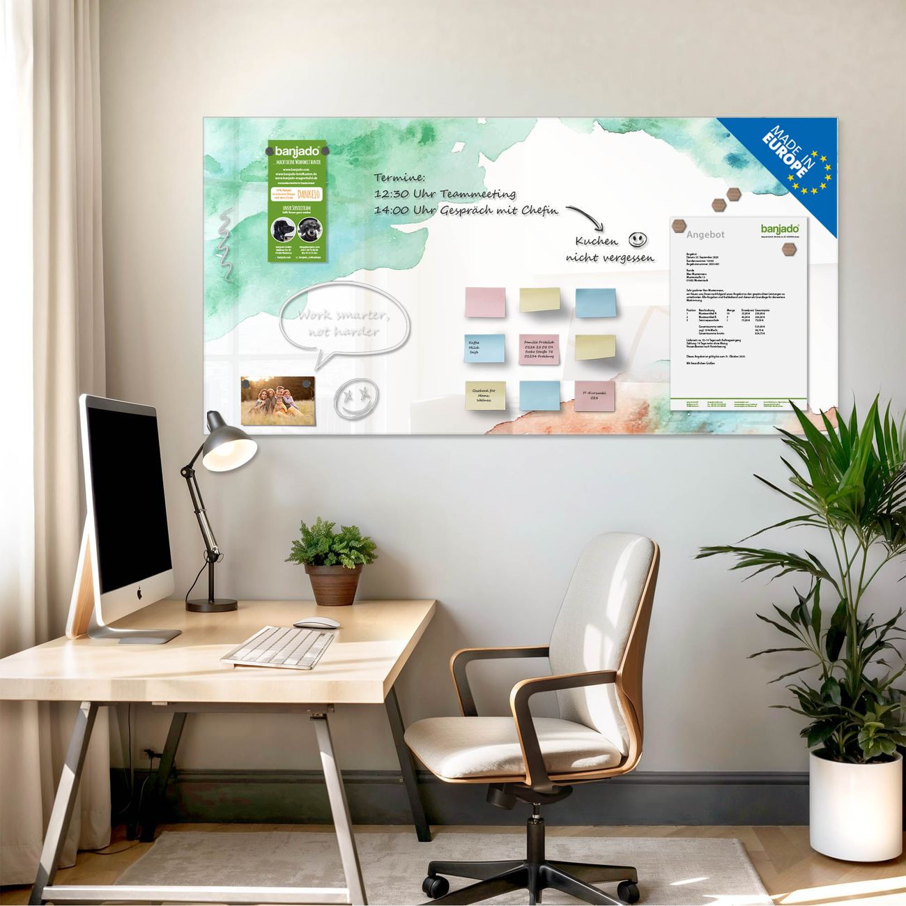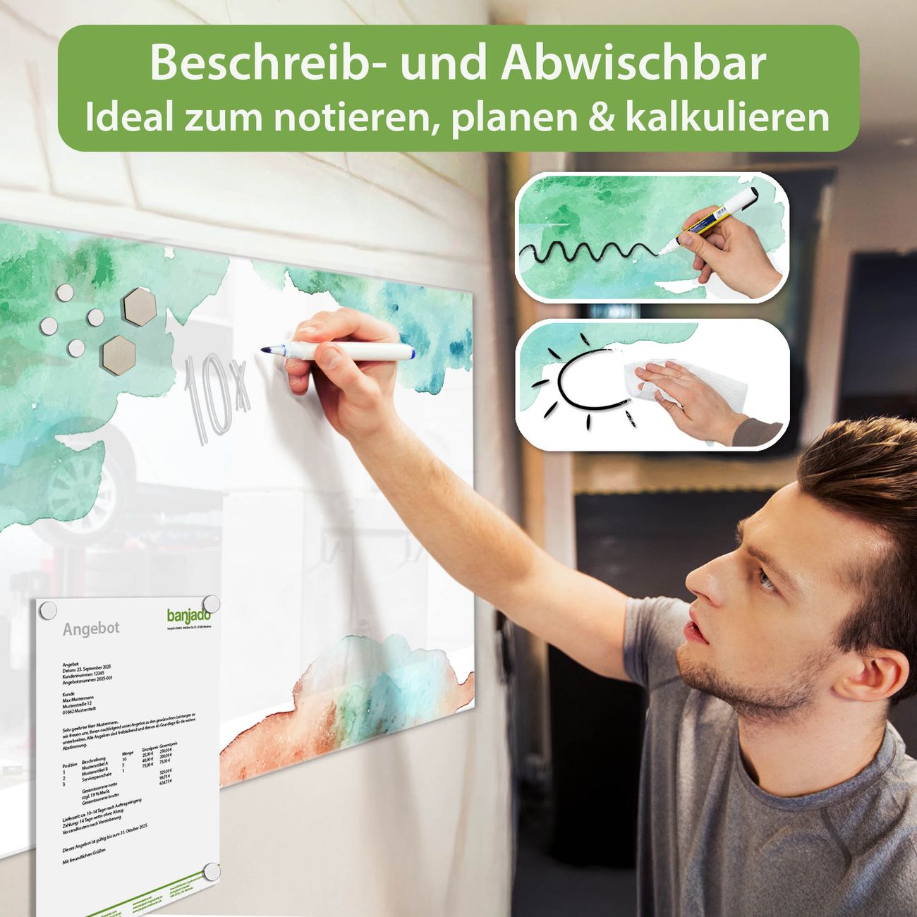 Jede Glas Magnettafel wird in unserer Werkstatt von Hand gefertigt und sorgfältig geprüft. So erhalten Sie ein echtes Qualitätsprodukt, das Funktion und Ästhetik perfekt vereint.?? Warum banjado?