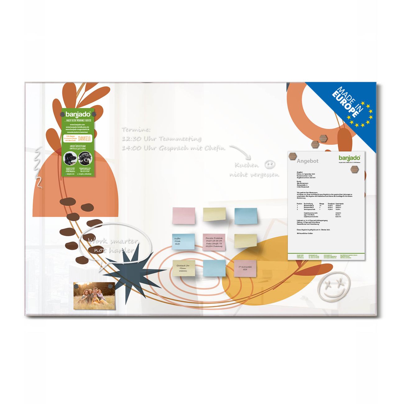 Jede Glas Magnettafel wird in unserer Werkstatt von Hand gefertigt und sorgfältig geprüft. So erhalten Sie ein echtes Qualitätsprodukt, das Funktion und Ästhetik perfekt vereint.?? Warum banjado?