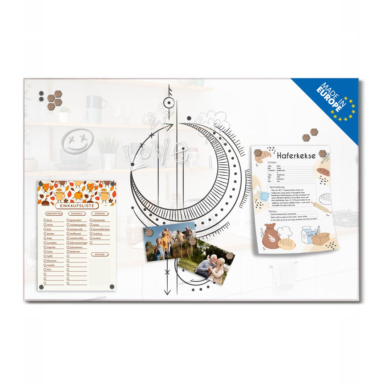 Auf der glatten Glasoberfläche lassen sich Termine, Rezepte oder Notizen ganz einfach mit Kreidestiften festhalten und rückstandslos entfernen. Starke Neodym-Magnete halten Ihre wichtigsten Erinnerungen sicher an Ort und Stelle. So entsteht Ihre ganz persönliche Ideenwand - jeden Tag neu.