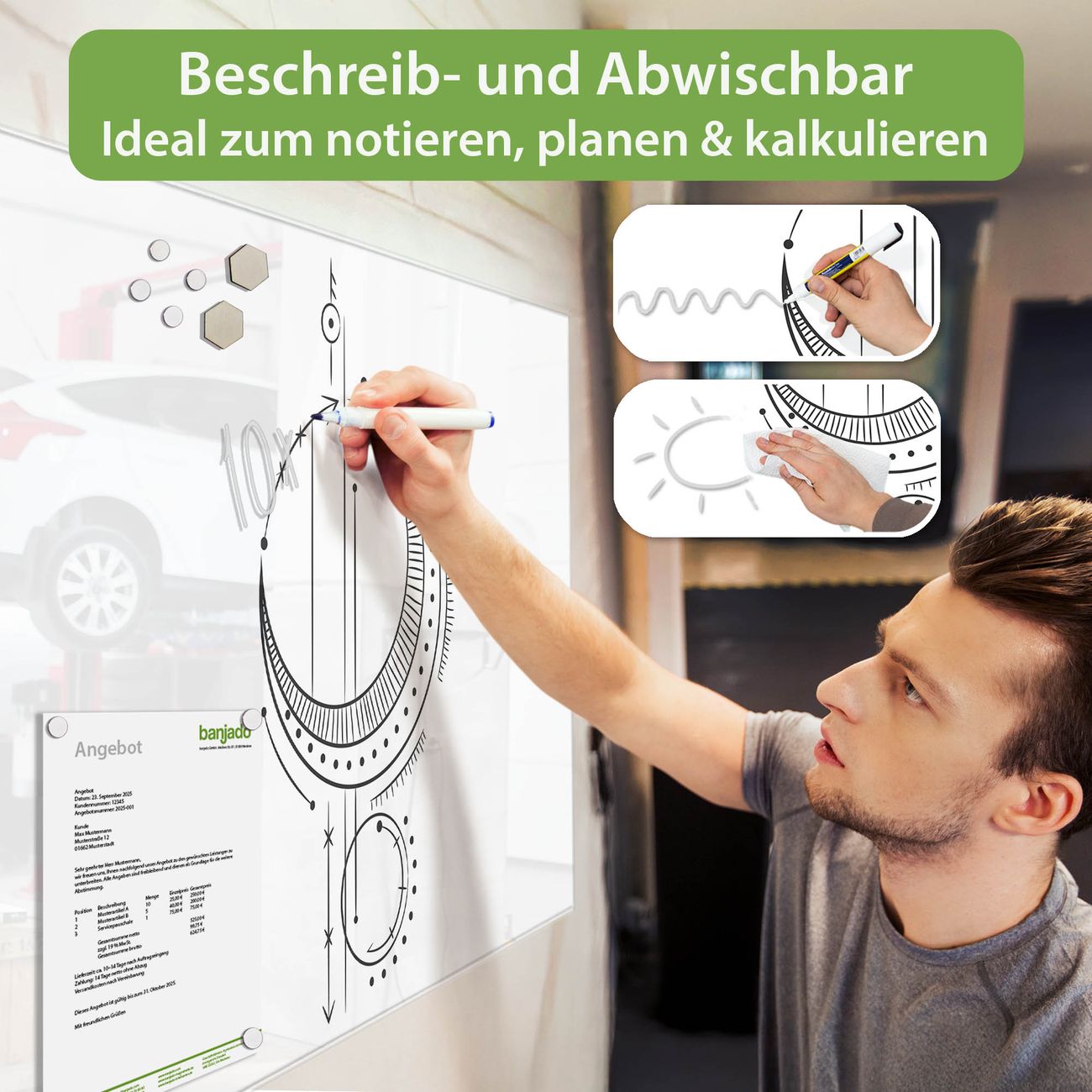 Bitte beachten Sie, dass ausschliessliche spezielle Magnete an der Glastafel haften. Wir empfehlen banjado Neodym Magnete, diese sind durch uns auf Wirksamkeit geprüft.